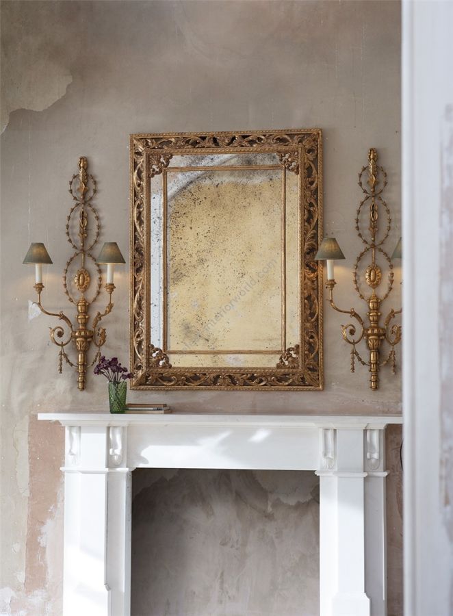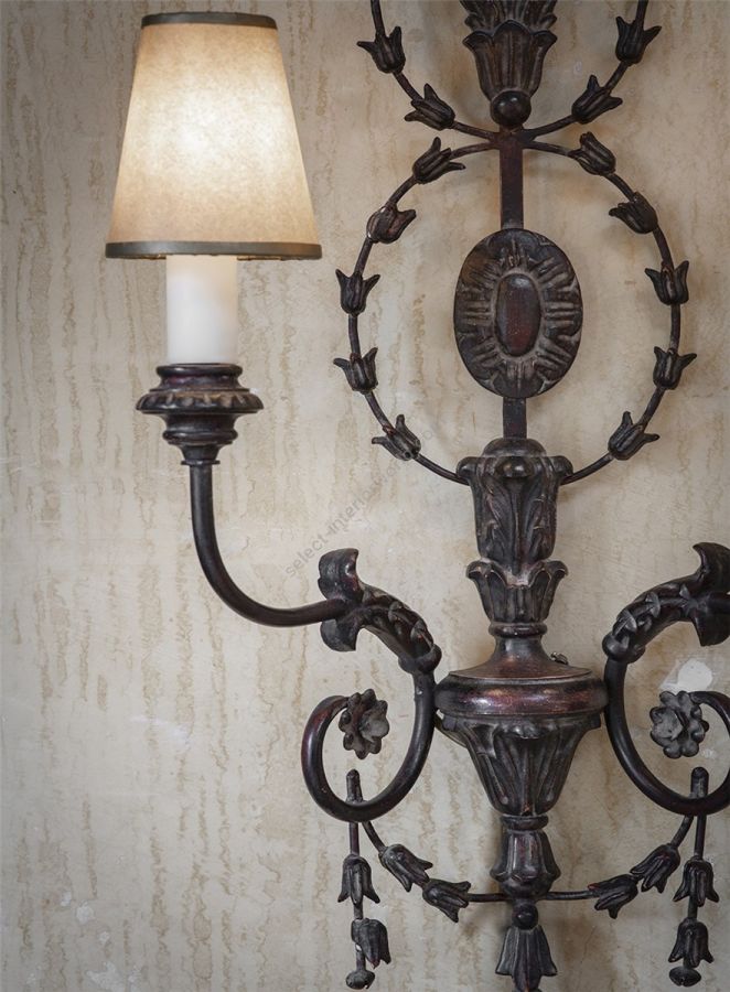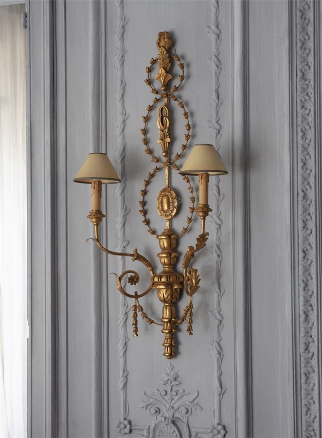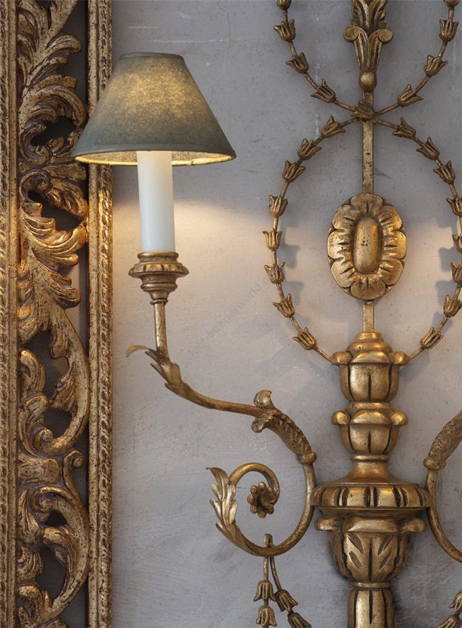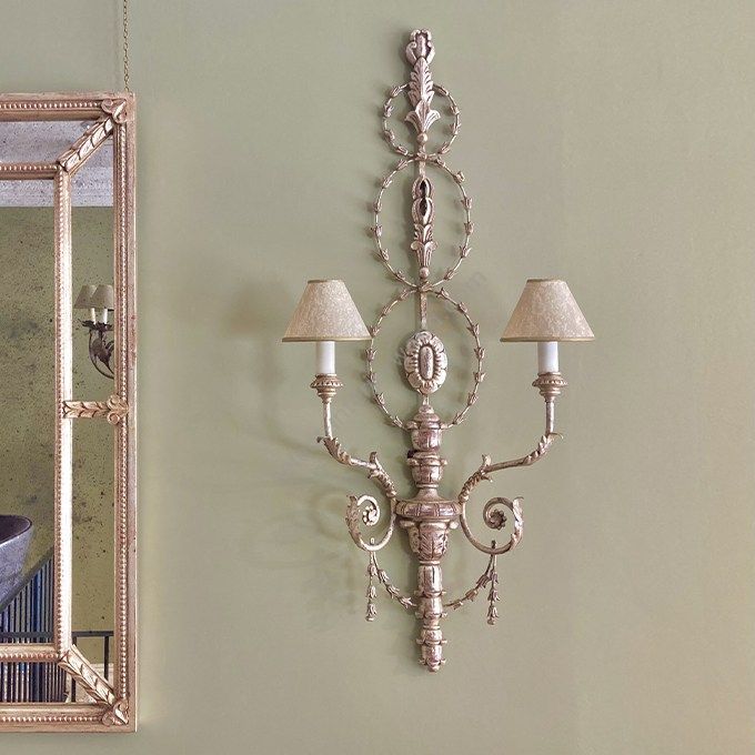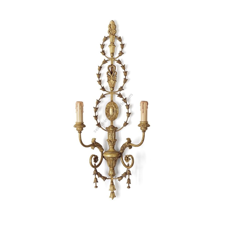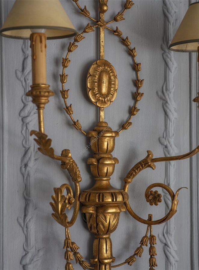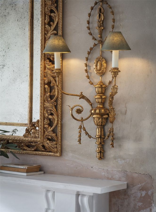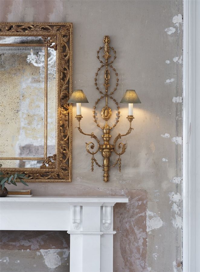 The Adam design has a giltwood and metal neo-classical style. A very elegant 2 branch wall light, with delicate scrolls embellished with acanthus leaves. Our lights are made by skilled artisans. The unique range of highly decorative lights is created by hand using traditional materials, carved wood, wrought iron, and gilding with subtle patination.