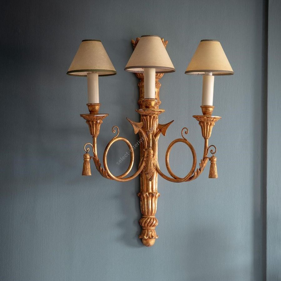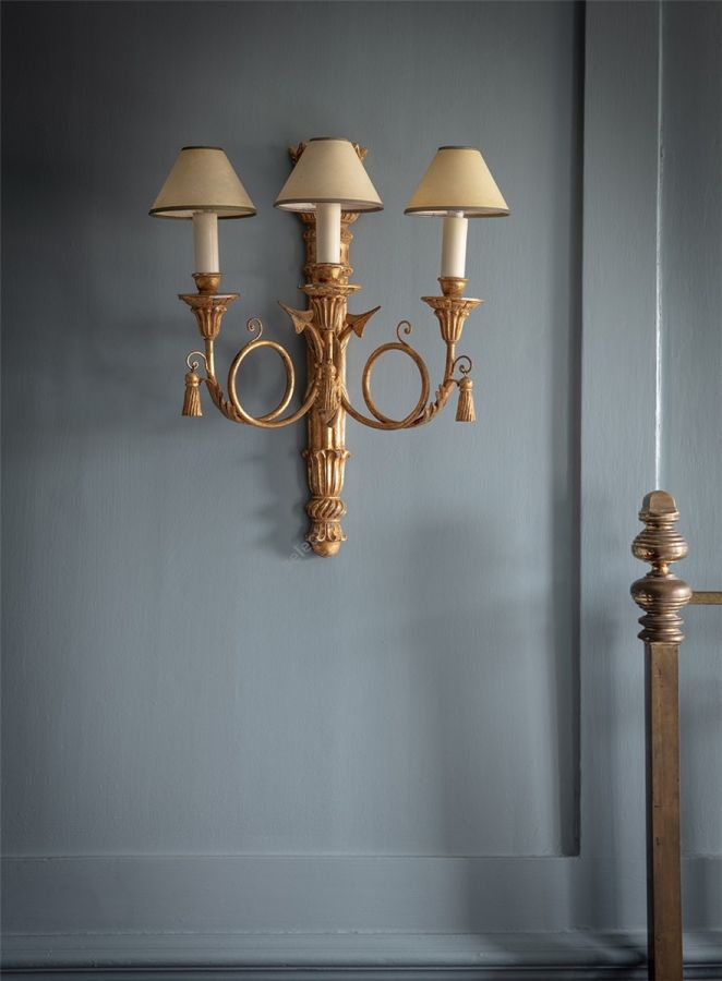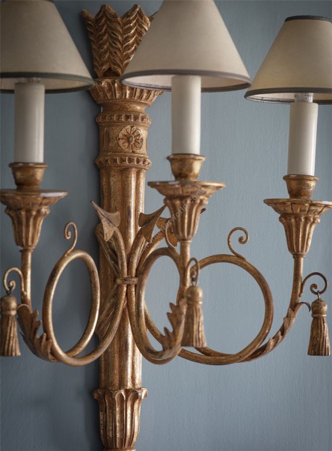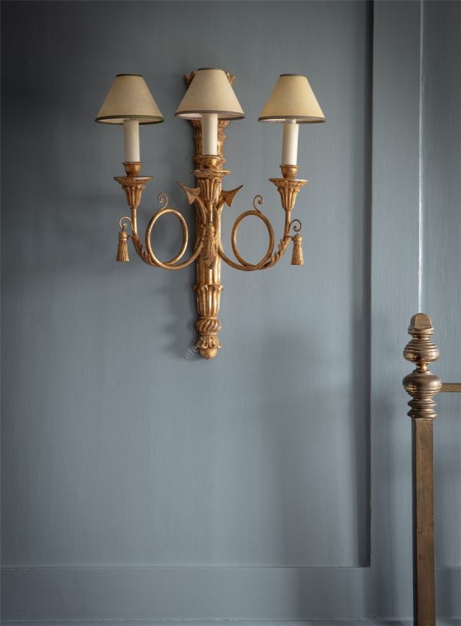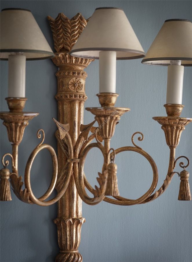 The Athena is a Regency style decorative three-branch wall light. Its body is carved as a quiver of arrows made of three scrolling branches, and it also features carved pendant tassels.