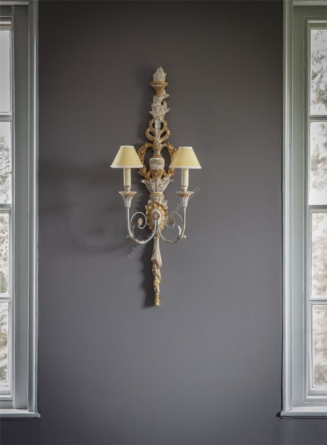 A tall, elegant giltwood wall light, the Delphis features classical motifs including flower garlands, swags and acanthus leaves.
