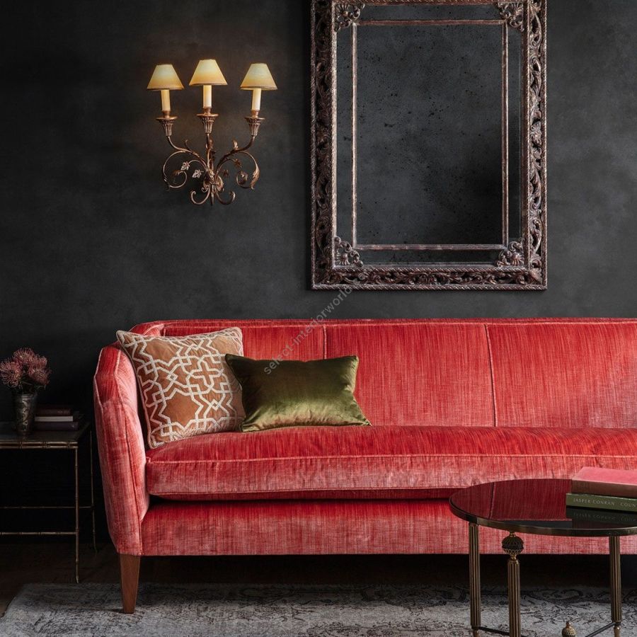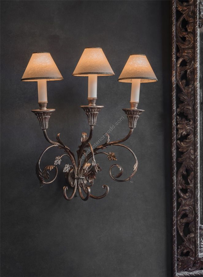 The Pisa is a tall, three-branch wall light, with a light but metallic design comprising scrolls and leaves.