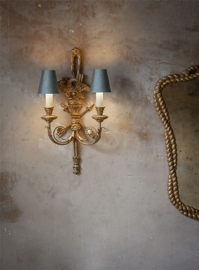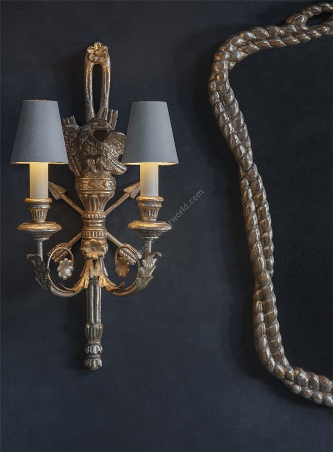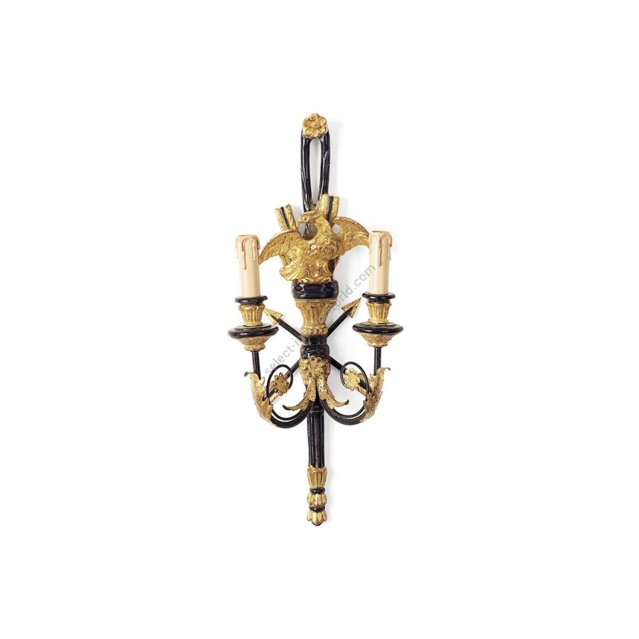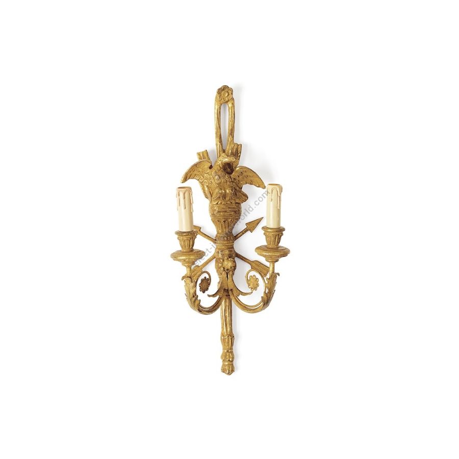 A finely carved decorative wall light. This light has two branches scrolling from a classical column, it includes crossed arrows and an elaborate eagle decoration suspended from a carved swag. Available with left and right facing eagle.