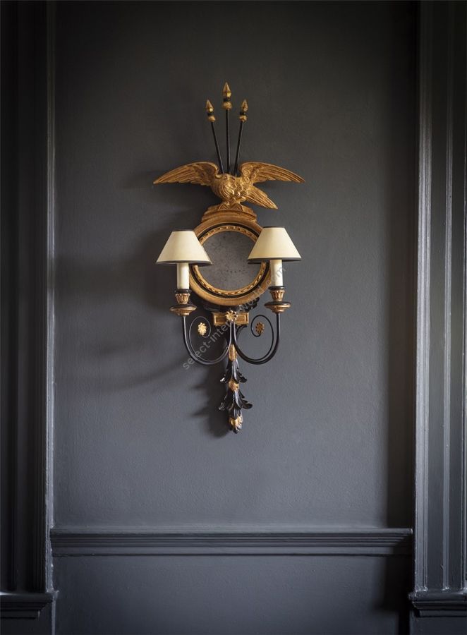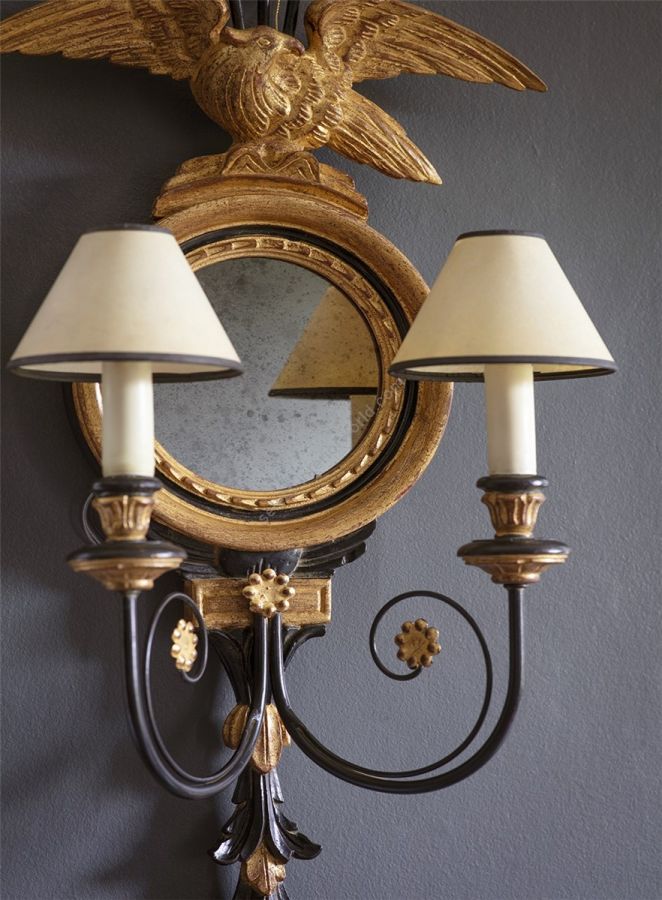 This unusual two-branch wall light, in the exuberant High Regency style, features a round, carved porthole mirror surmounted by a clutch of arrows and a triumphant eagle.