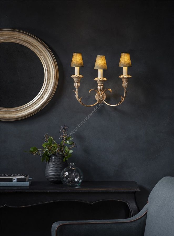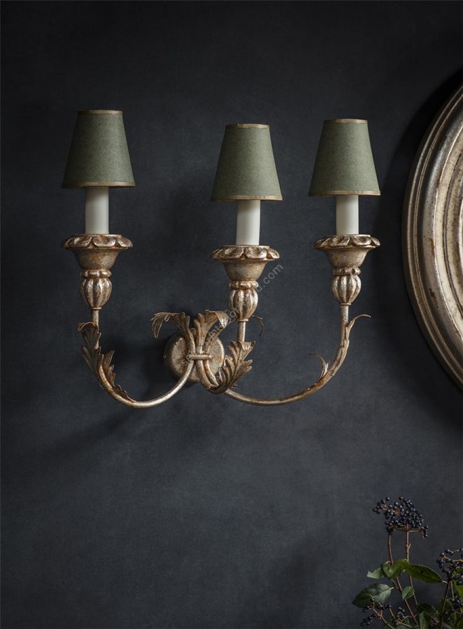 The Turino is a three-branch wall light with carved wooden bulb holders supported by scrolling arms decorated with carved acanthus leaves.