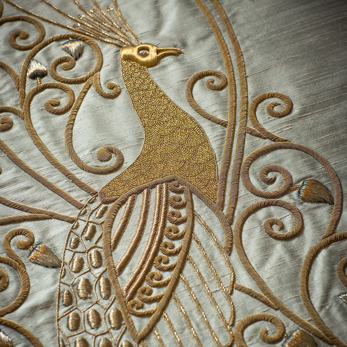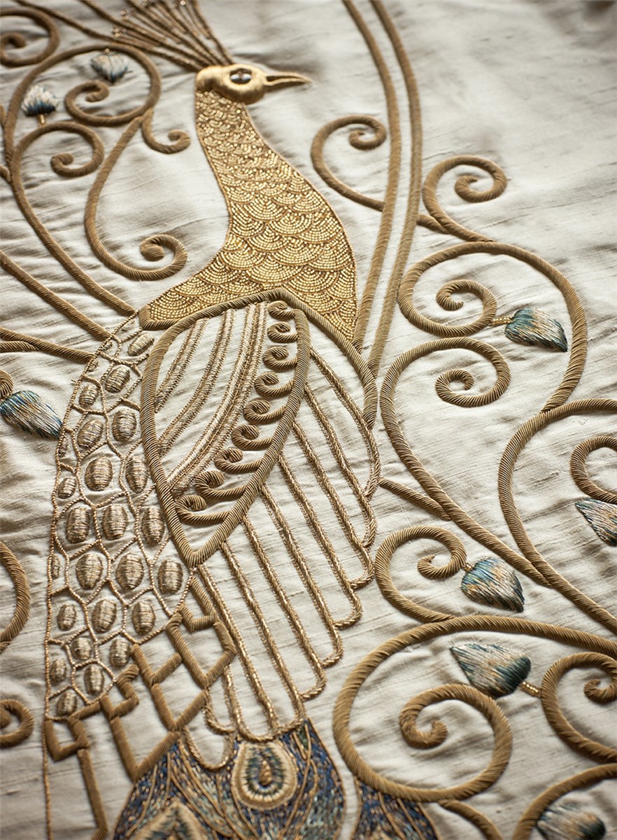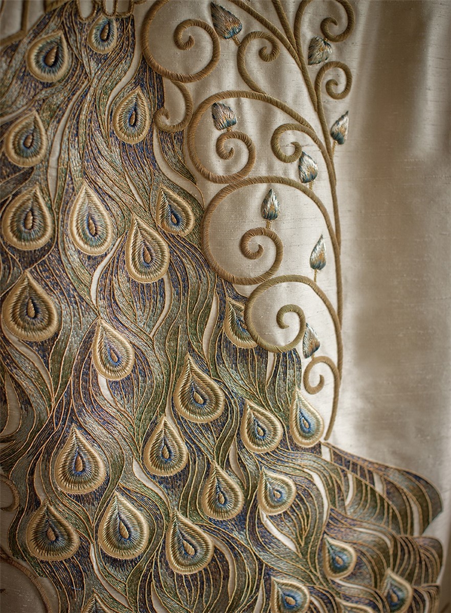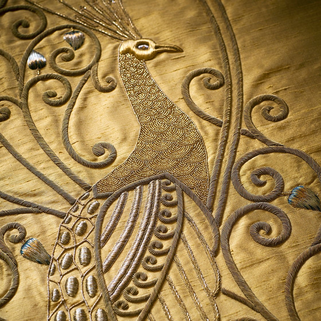 Juno is a marvellously dramatic panel combining the exotic plumage of peacocks with a beautifully worked scrolling design in gold thread.