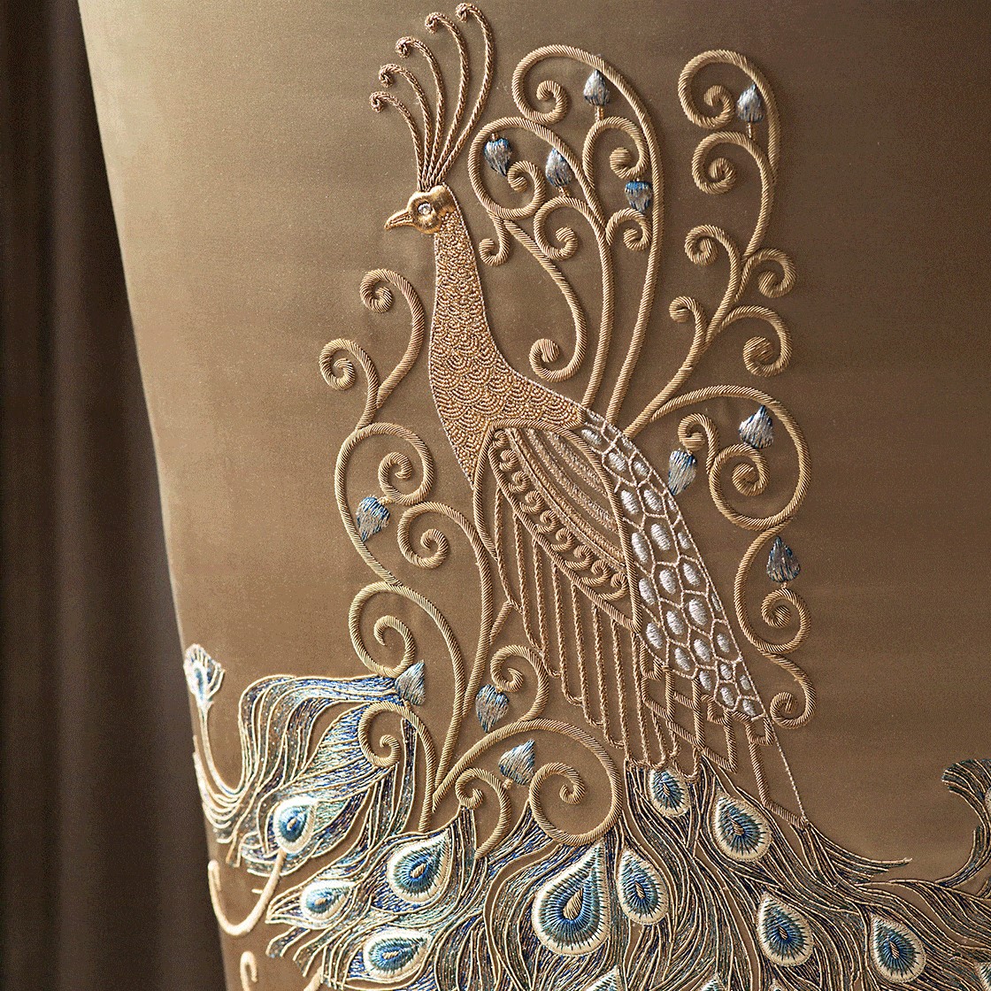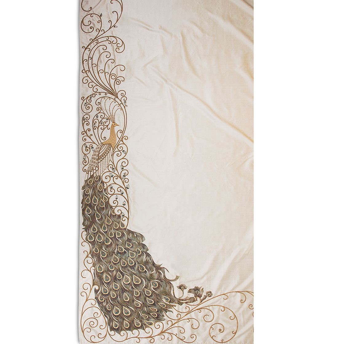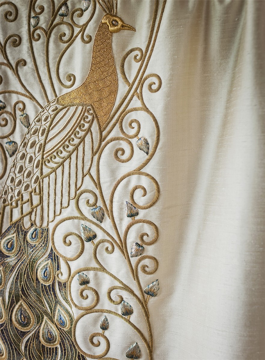 Juno is a marvellously dramatic panel combining the exotic plumage of peacocks with a beautifully worked scrolling design in gold thread.
