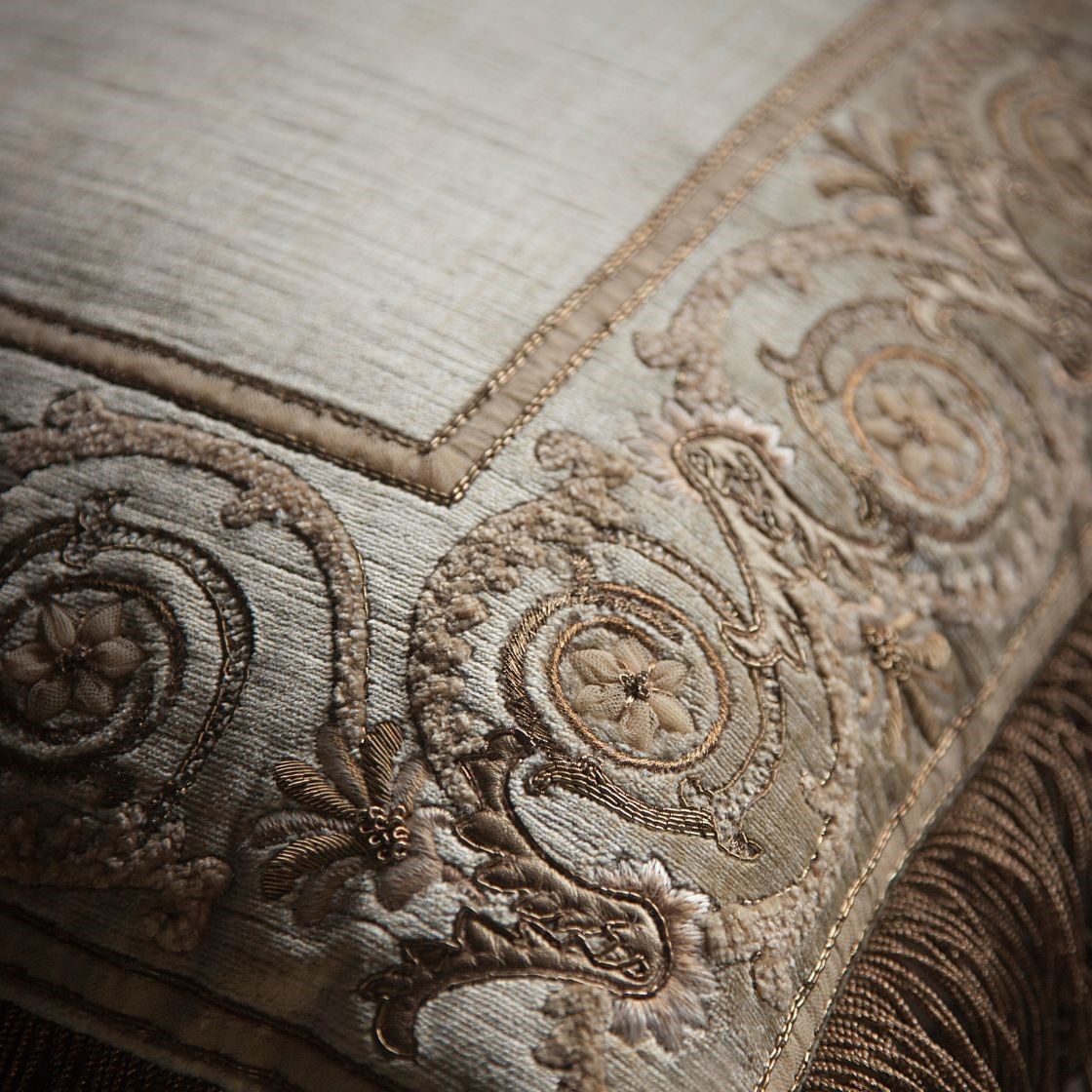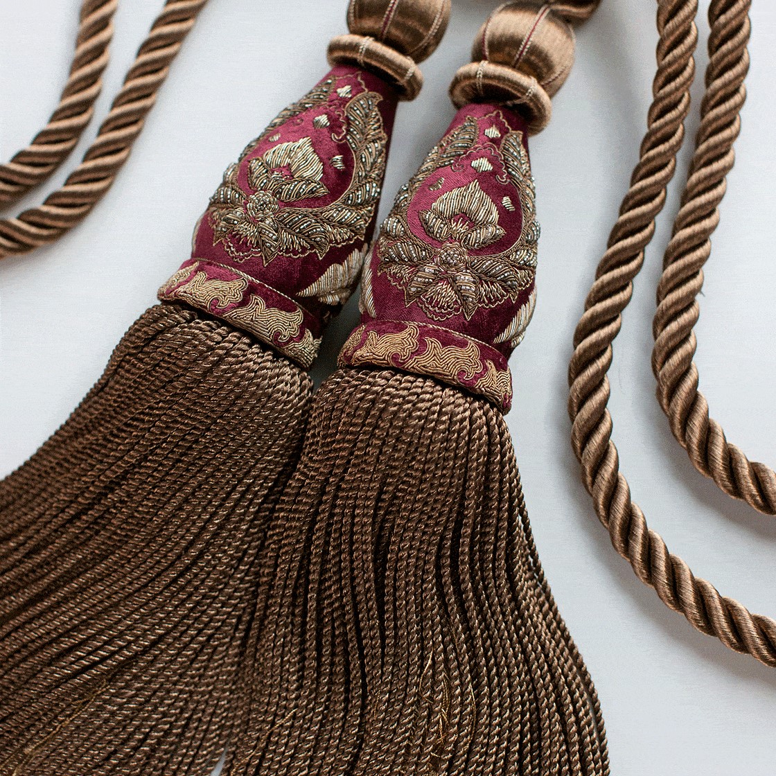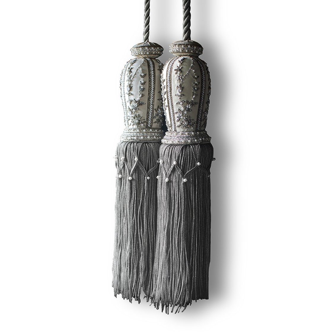 Our Couture tie backs are bespoke and hand crafted to order. They can be made in fine gold, silver bronze, pewter or silk threads and embellished with freshwater pearls and semi-precious stones.| Length of Tassel Without Cord | 40cm |
