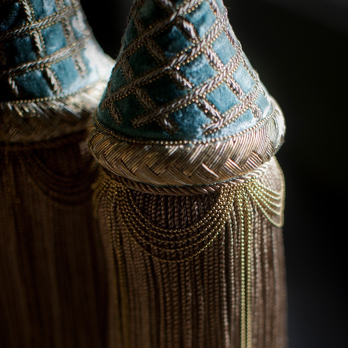 The Desdemona tie back has an elegant tapering conical body, finely worked with a trellis pattern in gold thread and old gold swags over rich gold fringing.