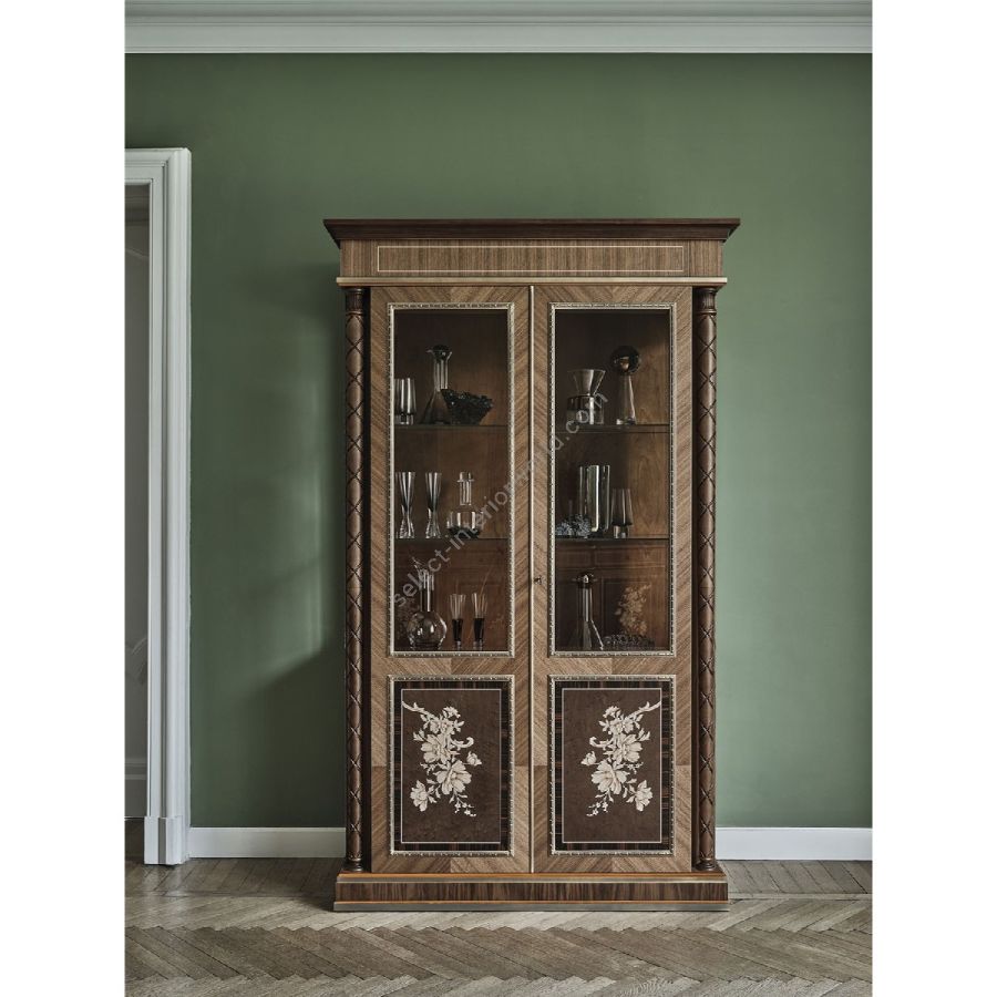 A new floral inlay serves as the fil rouge of the table, sideboard, and display case in this dining room, drawing inspiration from a piece of embroidery found in a historical document in a London Museum archive. The tones of mandarin and the unique bronzed paint are revealed in the finishes of the surrounding furniture, including the sideboards, which enhance the delicate carvings in the solid wood. The glass cabinet is inlaid with Canaletto walnut, erable, ebony, and maple, with profiles decorated with bronzed varnish, and features carved decorative columns in polished Canaletto walnut tonality, further adorned with bronzed varnish and lacquered mandarin details. Designed by Bellotti Ezio Team, this piece captures the fusion of artistic craftsmanship and refined design.