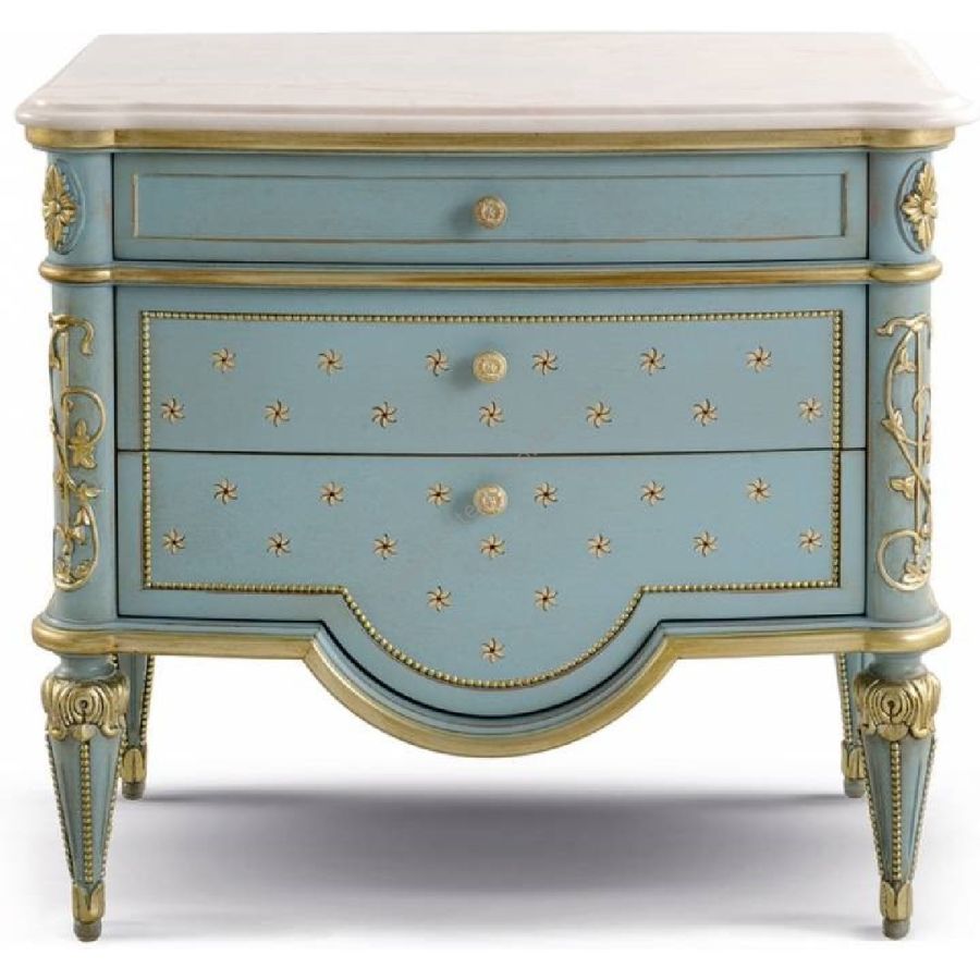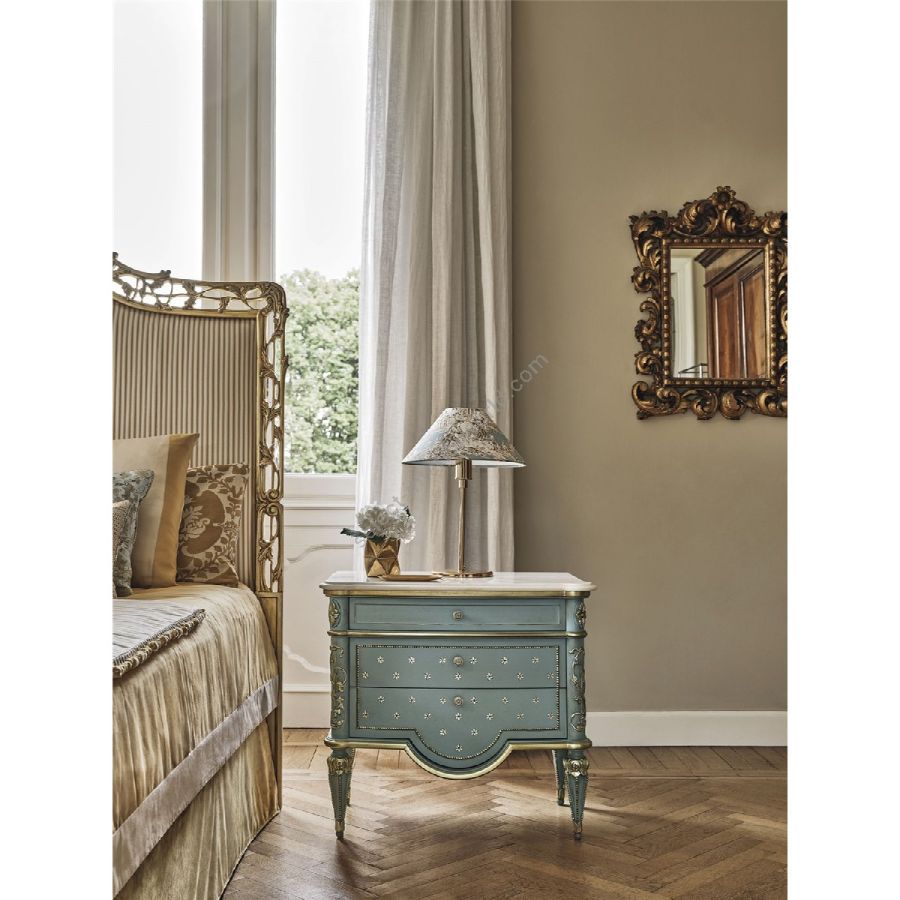 Inspired by the enchanting concept of "The Thousand and One Nights," this bedside table is a masterpiece that evokes the allure of a magical bedroom. Finished in soft anise tones, it is adorned with a new handmade floral decoration, beautifully highlighted by a sophisticated light blue and champagne gold palette. The carved elements and the marble top in Rosa Portogallo Estremoz elevate its charm, while the lacquered brushed anise finish, coupled with Silver Gold leaf details and intricate hand-painted decorations, exude a sense of refined elegance. Designed by the Bellotti Ezio Team, this piece brings a sense of timeless luxury to any bedroom.