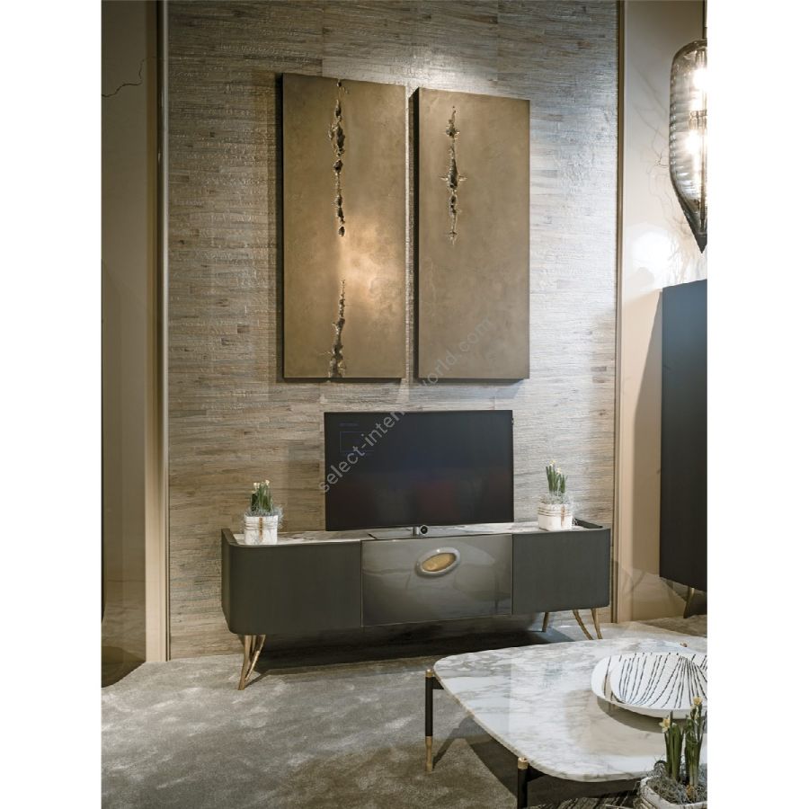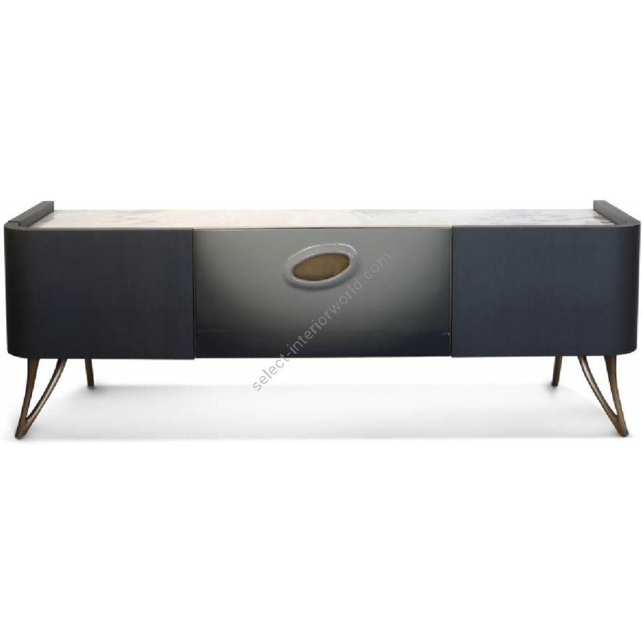 This TV cabinet features a grey-stained Ash veneered structure, with a central drawer in polished polyester and a Dover White marble top. Sculptural feet and internal elements in light bronzed matt brass add a touch of refinement and sophistication. Designed by Ezio Bellotti, this cabinet blends modern design with timeless elegance, making it a perfect addition to any contemporary living space.