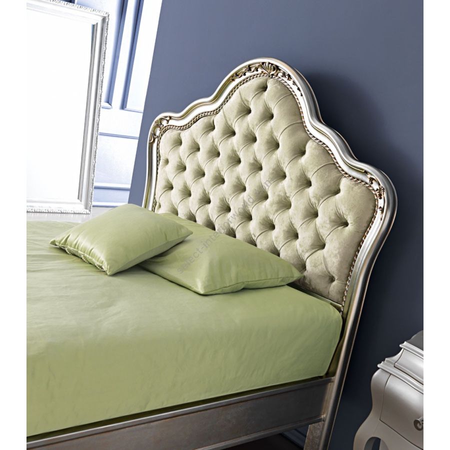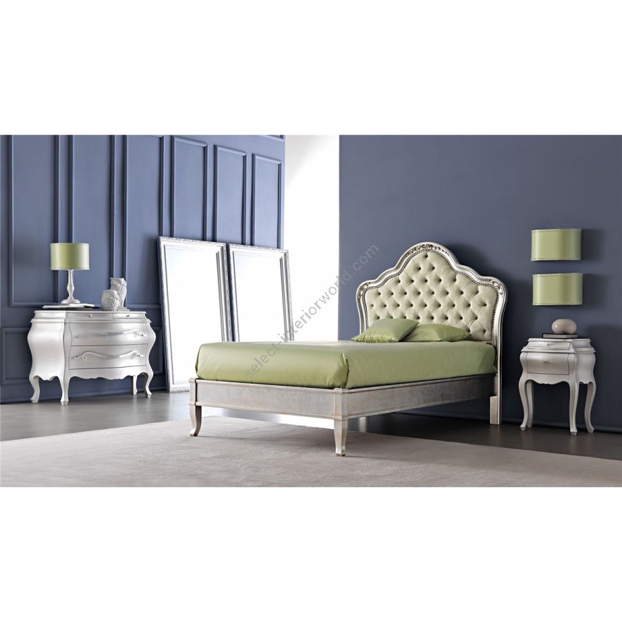 Wooden bed with a classic and refined line with a curved shaped padded headboard covered with capitonné, quilted or smooth technique. The harmonious curves of the headboard are enriched by carved decorative motifs that emphasize the chiaroscuro of the frame. Edge frame and bedfoot in solid wood, available in straight and shaped version