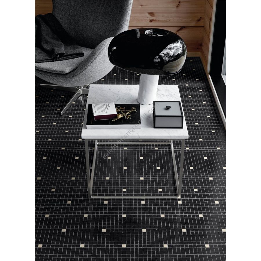 The decorative patterns in the marmosaico collection are made with honed marble mosaic tesserae, measuring 1,5x1,5 cm, with matt finish.