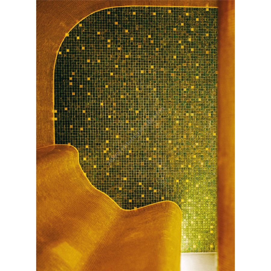 Glass mosaic composed of beveled, randomly arranged square tesserae. The oro bis tesserae present in the blend are fashioned with 24 kt gold leaf between two protective layers of glass.