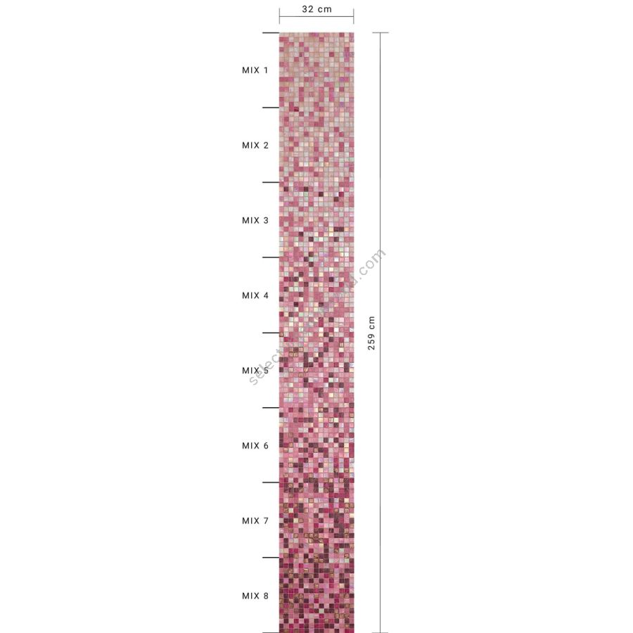 The oleandro whiteless shading blend is a sequence of mosaic blends arranged in a gradation from light to dark, made with 20x20 mm glass tiles. The shading blend is made up of 8 sheets, with one mix per sheet (mix 1, mix 2, etc.), For an overall height of 259 cm. The individual mixes of the standard shading blends can be sold per sqm. This item is sold by the module. Module dimensions: 0.32x2.588 m (0.83 sq. m). For any customizations, click on “Request information”.