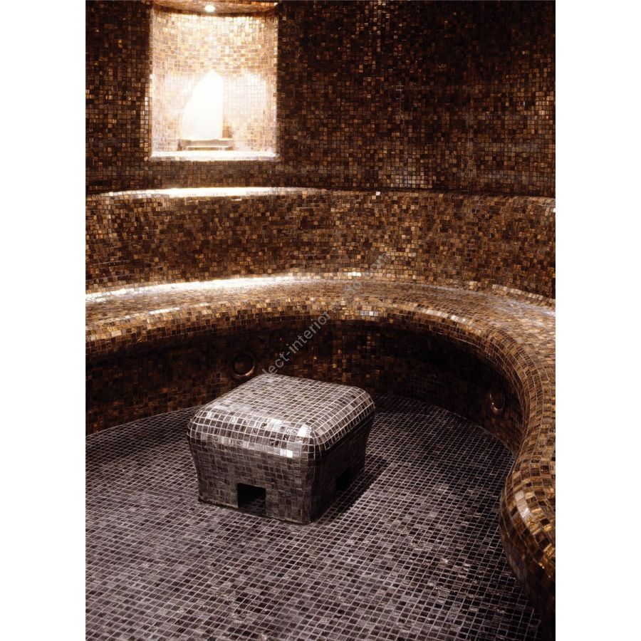 The le gemme series is fashioned using artisan techniques and expert hand-craftsmanship that make each tessera unique, luxurious and one-of-a-kind. The individuality of this series derives from the special glass-coloring technique that includes the addition of aventurine and colored enamel granules. Aventurine is a type of glass obtained through artisan craftsmanship, a technique passed down by the murano glass masters for centuries. Copper crystals mixed with brilliant metal oxides are found inside aventurine where they create a golden scintillating flamed effect in the mosaic tesserae. Also available in the matt version, with opaque and slip resistant finish.
