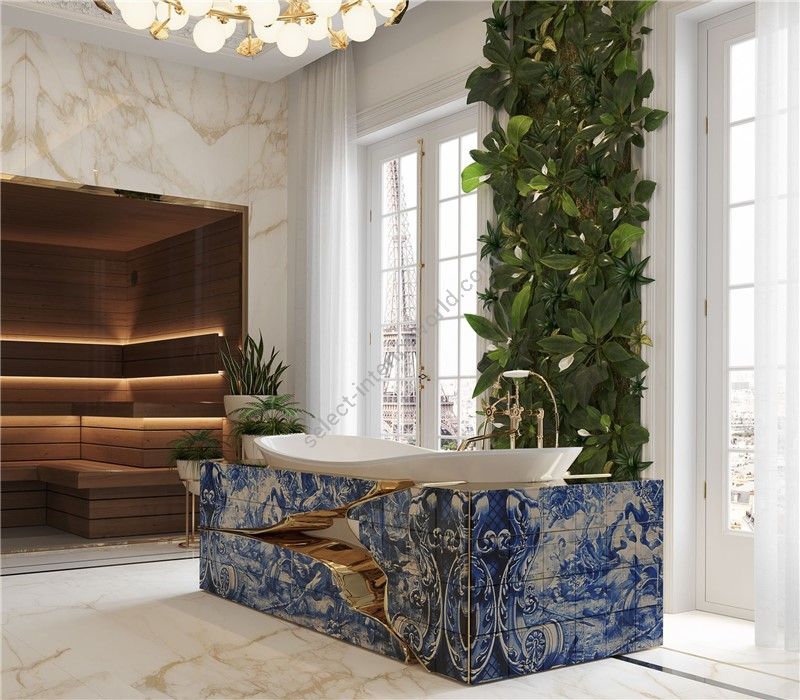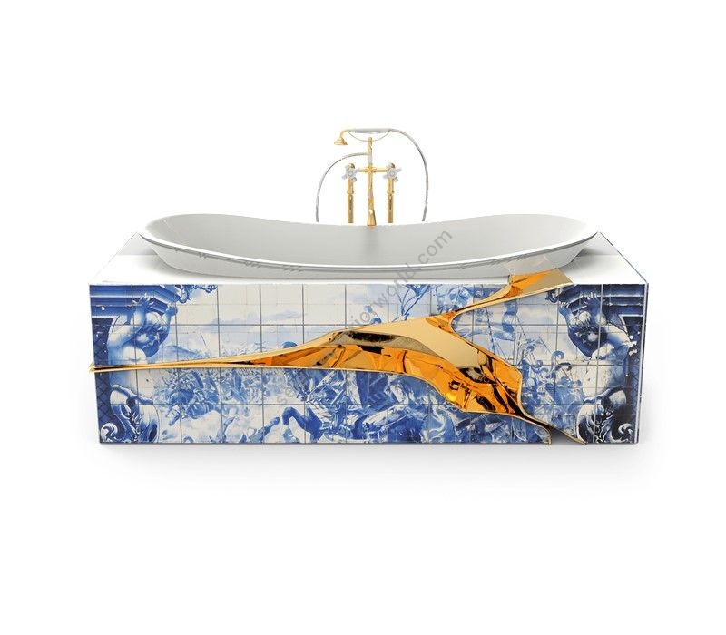 Heritage bathtub takes exceptional craftsmanship and design to a new realm. A statement bathtub covered in traditional hand-painted tiles, one of the most representative art forms of Portuguese culture, featuring a gold-painted tear finished with high gloss varnish. A sophisticated tub of high gloss black or white lacquered cast iron.