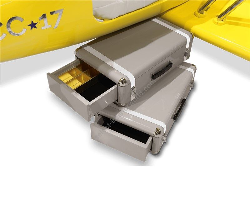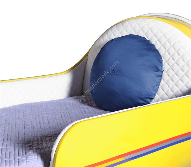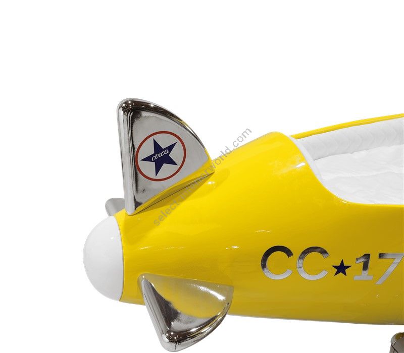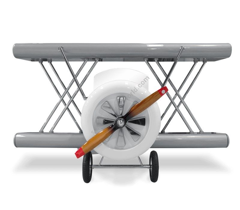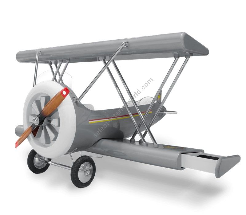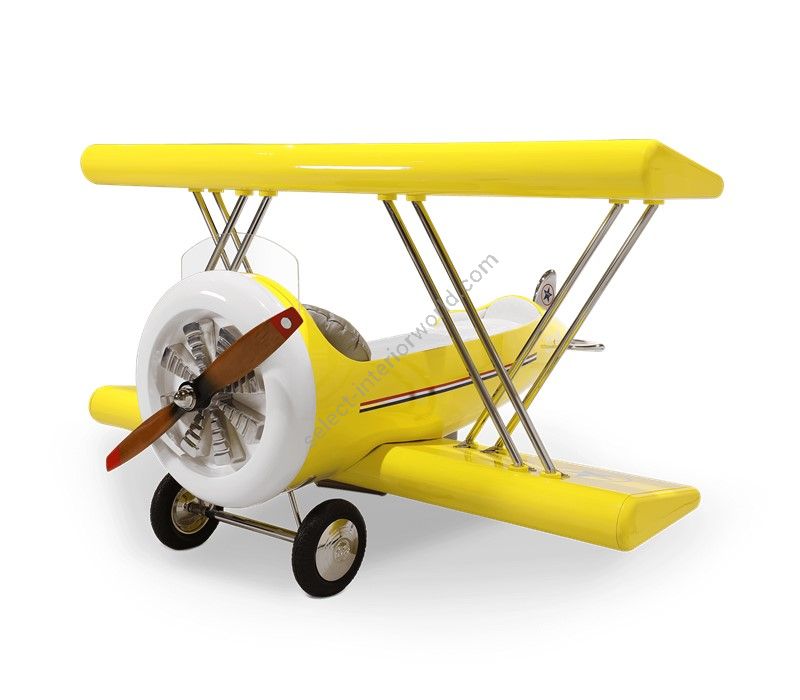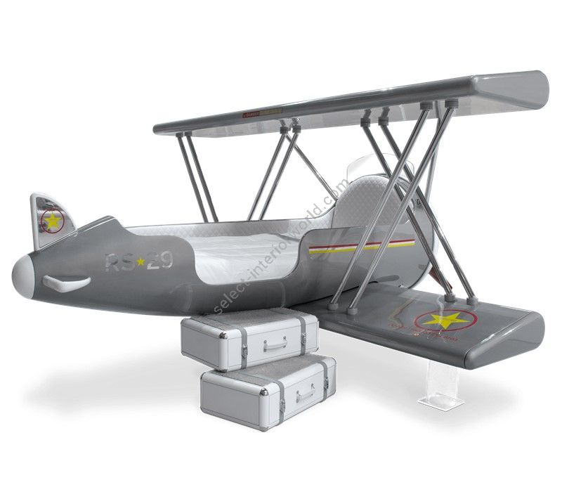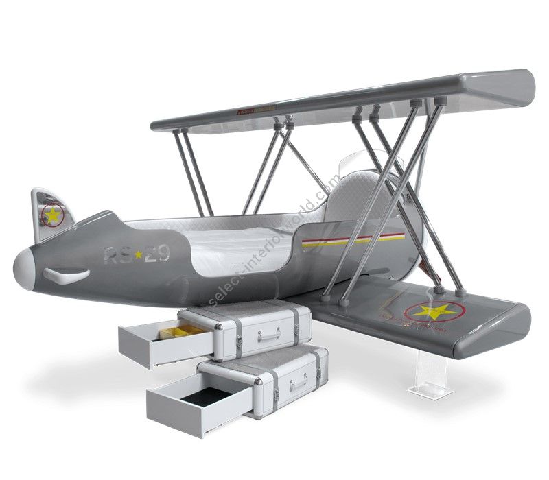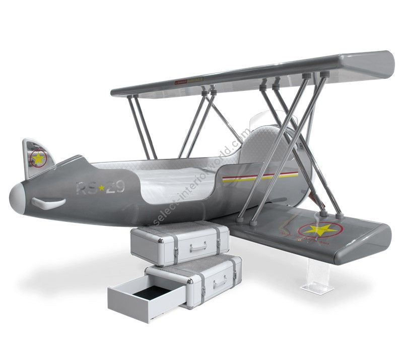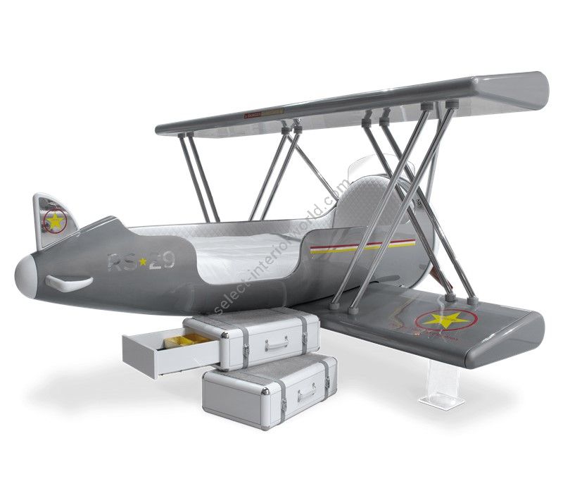 The Sky B Plane is an airplane kids bed with an aviation-inspired design that it’s meant to be educational and engaging. An airplane theme decoration for kids’ rooms is perfect to encourage the adventurous spirit of children.Inspired by kids’ fantasy world, they will easily relate this kids’ themed bed to the Disney movie “Planes” character Leadbottom, an iconic biplane wing aircraft used in the early years of aviation.The body is entirely made of fiberglass with glossy varnish applied and chrome plated finishes in the engine and wheels. The Sky B Plane has several storage compartments and the top wing is designed to be used as a bookshelf. The decorative suitcases include secret storage compartments and allow an easy access to the bed.