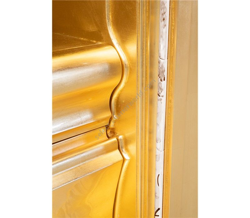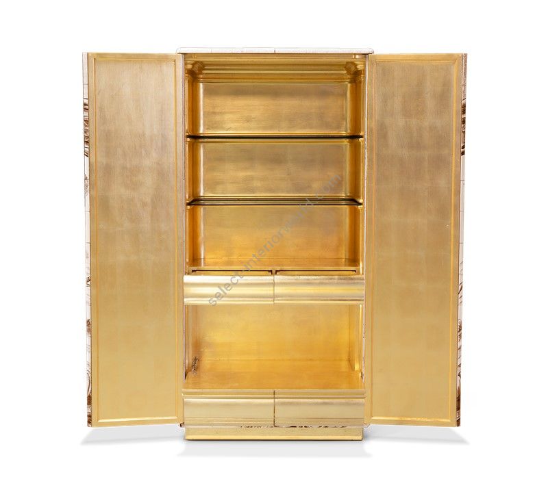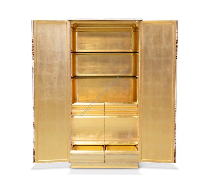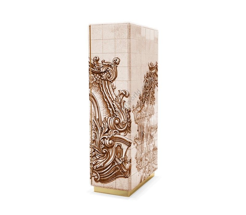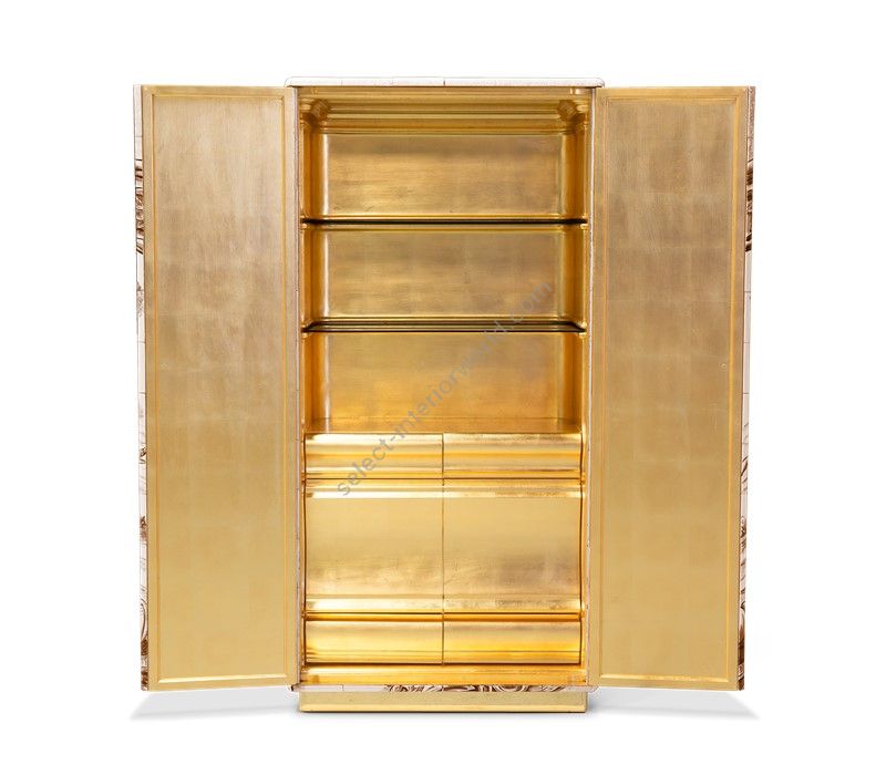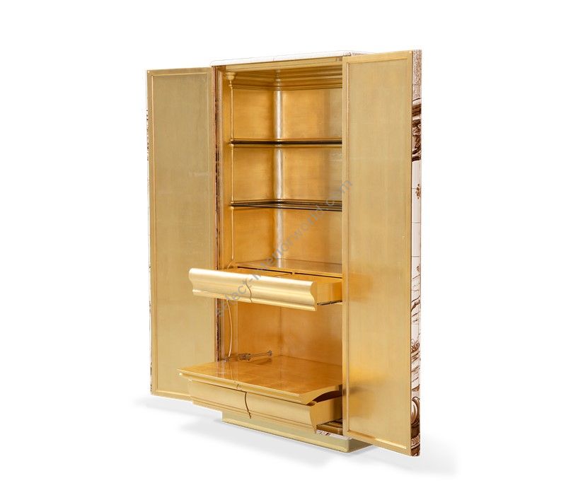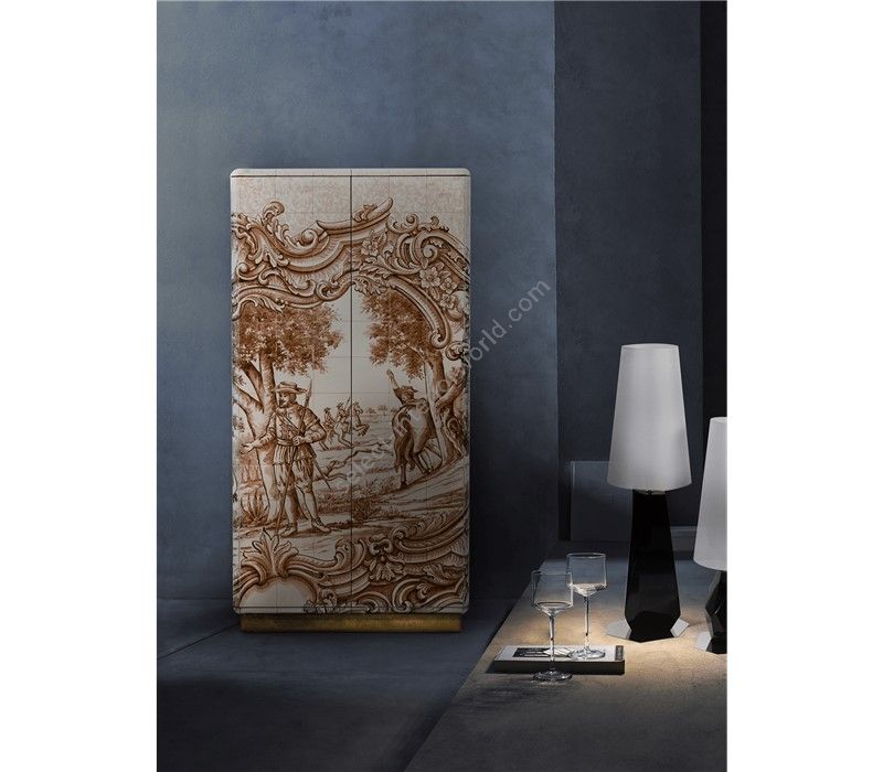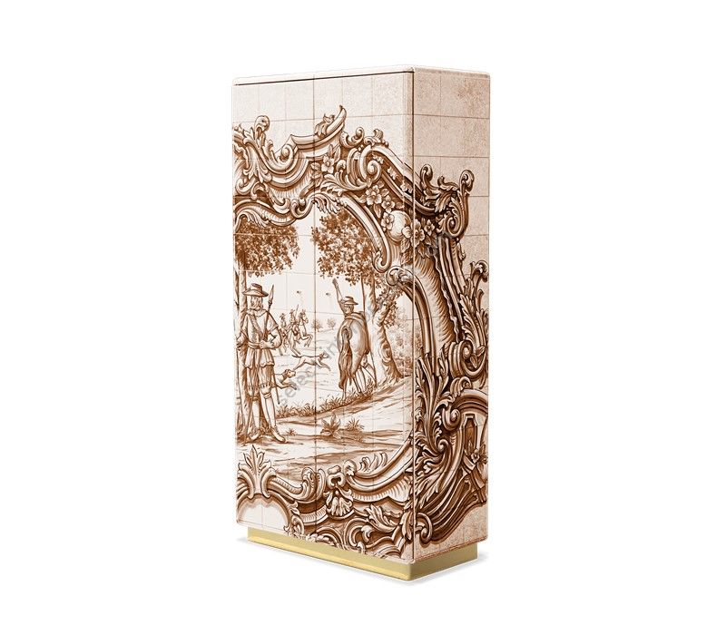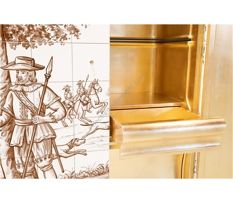 The Heritage Cabinet is a magnificent journey through Portuguese legacy. Covered in Azulejos, traditional hand painted tiles and one of the most representative art forms of Portuguese culture, the architectural cabinet portrays different scenes from the country’s Discoveries era. Centuries of history are gathered in a single final panel, and each layer is enhanced by vertical mirrors on the lateral surfaces. The hint of wander through the rich legacy continues when two doors open to a lined glossy gold leaf interior, and a classical ornament trim reminds the inside of churches and rich buildings. A clear glass shelve can be seen on the two individual divisions of the sideboard. A statement cabinet, the Heritage can take center stage in the most elegant rooms since its back is also fully hand painted. A lengthy tradition of bespoke and exclusivity to make one-of-kind design pieces.