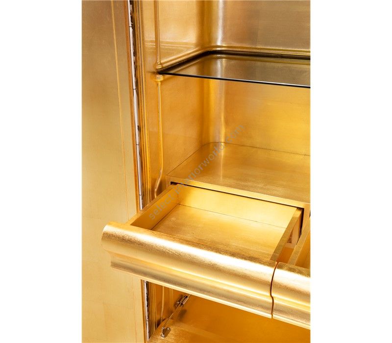 Cabinet lined with hand painted tiles. In its interior there is one door and four drawers fully lined with golden leaf. Contains two shelves made in bronze glass. The base is made from manually hammered brass.