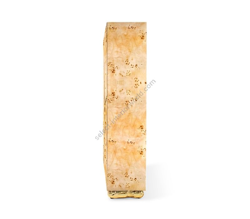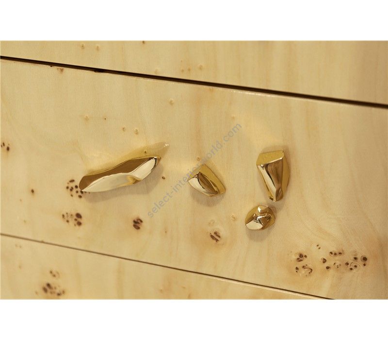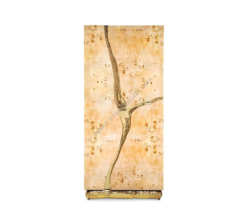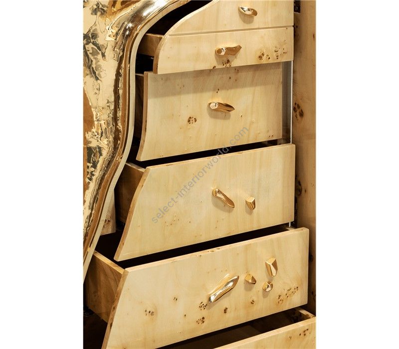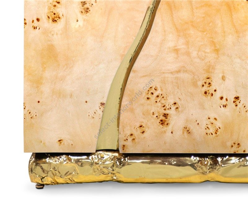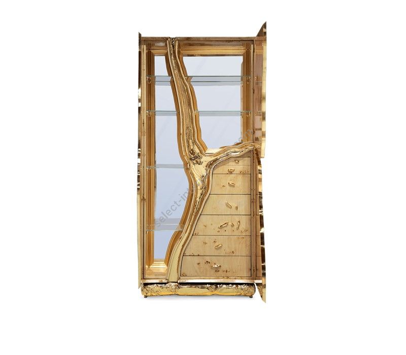 Coated exterior in poplar root veneer and gold finishes in hammered polished brass. Interior in Poplar Root & Polished Brass. Features 3 doors, 6 drawers, 6 glass shelves.