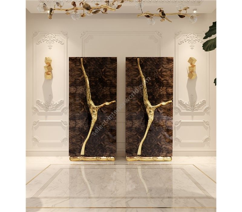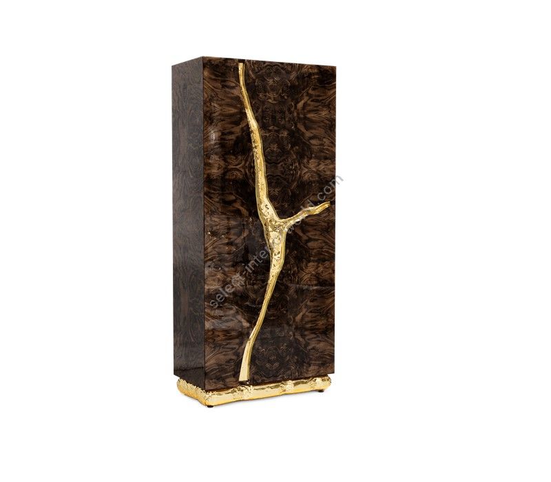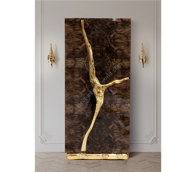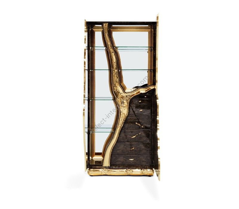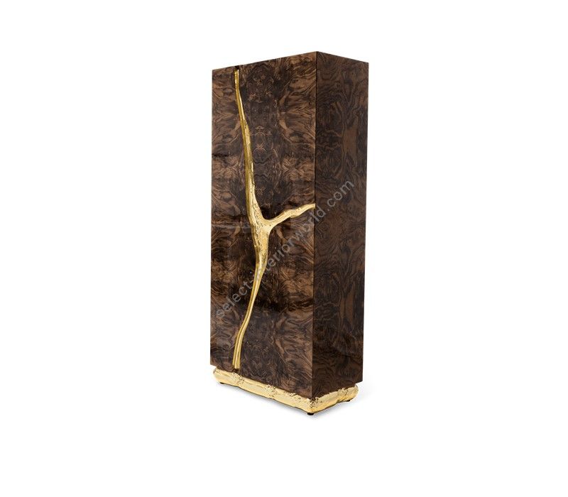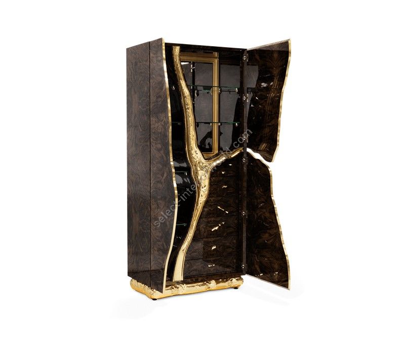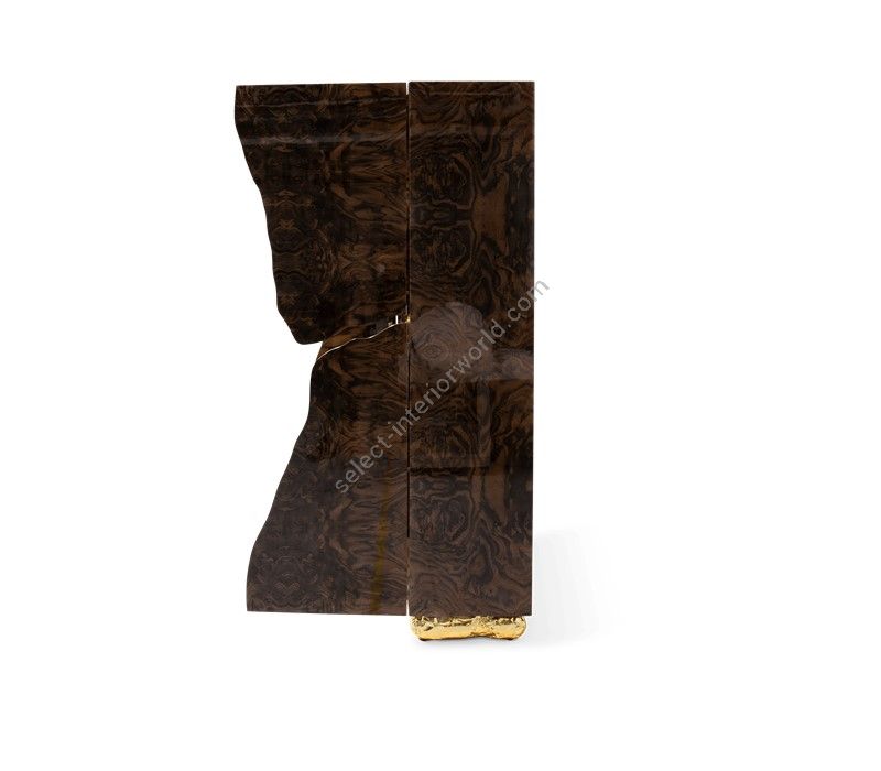 Lapiaz cabinet takes exceptional craftsmanship and design to a new realm. Finding beauty in the most unexpected places, this contemporary design piece is inspired by authentic karst formations. Its organic features are achieved through the manual fitting of polished brass, and a sharp finish in walnut wood veneer that portrays a perfect mirror. Different-shaped doors and drawer open to a distinct poplar root wood veneer interior. The hammered gold details and the mirrored façade conveys both dynamics and elegance, a beautiful duality between power and refinement to bring a new contemporary verve into interior design. A functional artwork piece born from cold and freshly cracked to showing off the world rich, golden details.