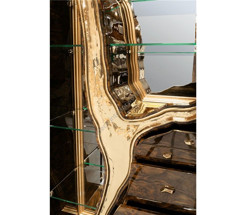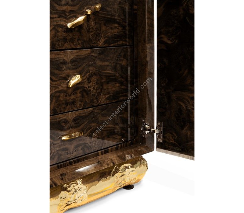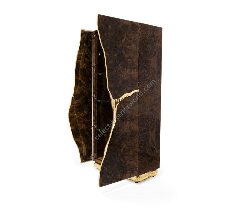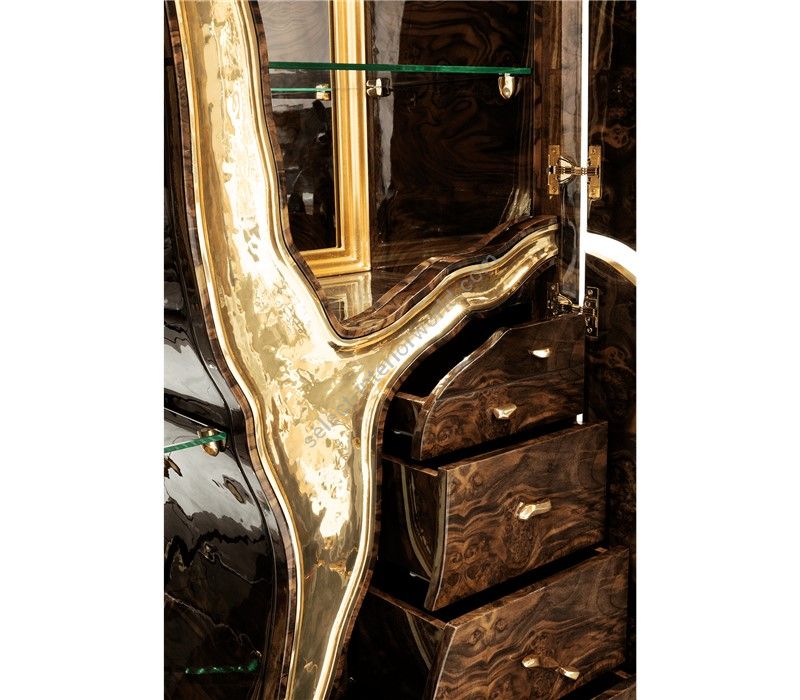 Coated exterior in walnut root veneer and gold finishes in hammered polished brass. Interior in Poplar Root & Polished Brass. Features 3 doors, 6 drawers, 6 glass shelves.