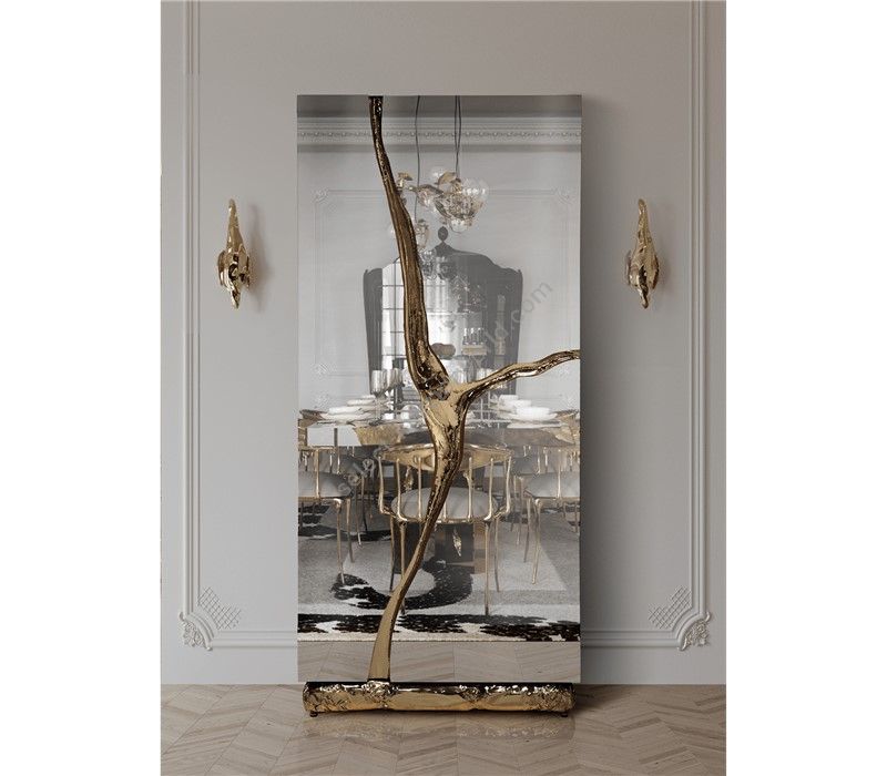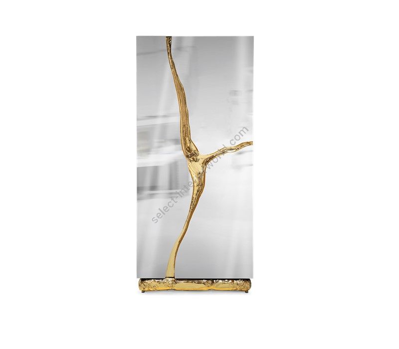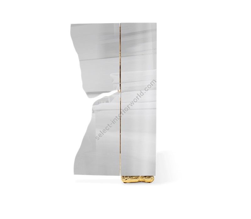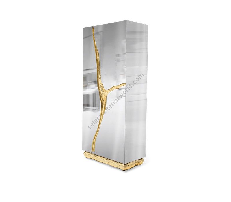 Lapiaz cabinet takes exceptional craftsmanship and design to a new realm. Finding beauty in the most unexpected places, this contemporary design piece is inspired by authentic karst formations. Its organic features are achieved through the manual fitting of polished brass, and a sharp finish in polished stainless steel that portrays a perfect mirror. Different-shaped doors and drawer open to a distinct poplar root wood veneer interior. The hammered gold details and the mirrored façade conveys both dynamics and elegance, a beautiful duality between power and refinement to bring a new contemporary verve into interior design. A functional artwork piece born from cold and freshly cracked to showing off the world rich, golden details.