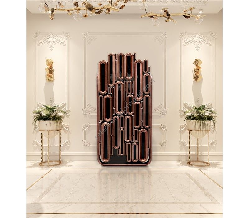 Frame made from wood covered in metal elements and a mirror in the interior. Finishing in black gold.