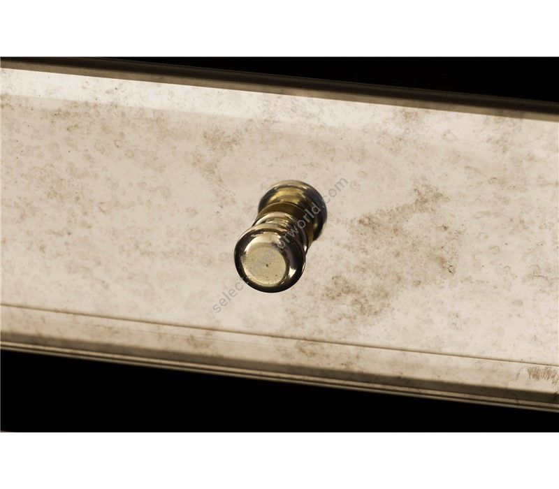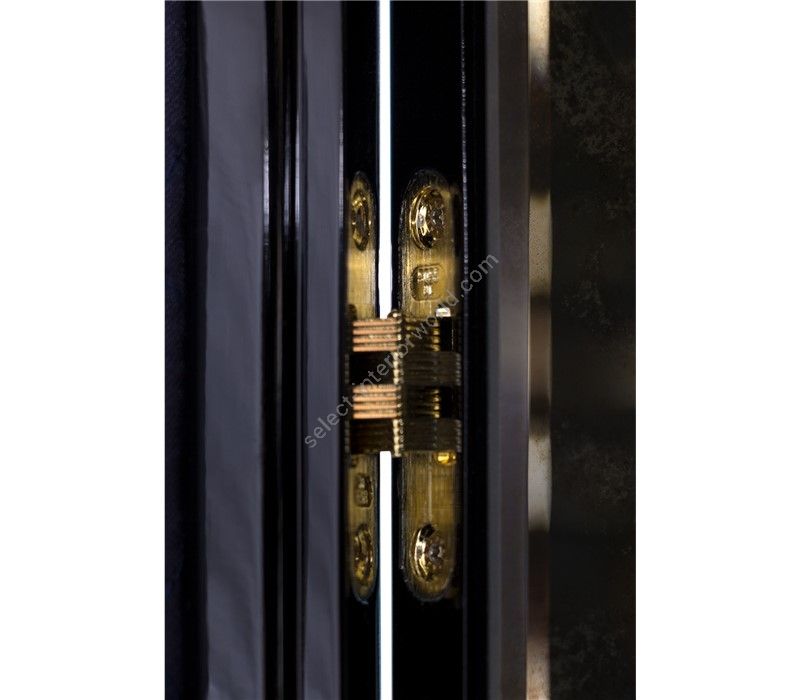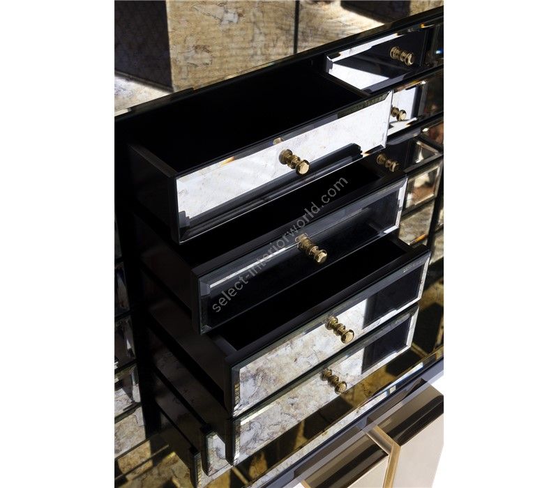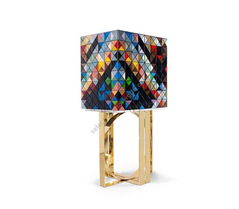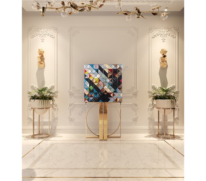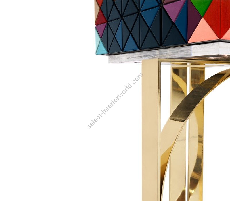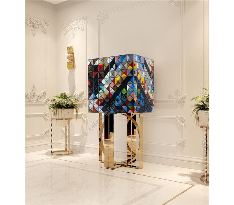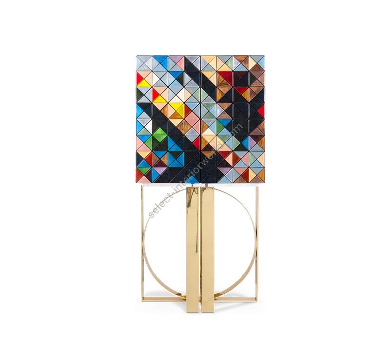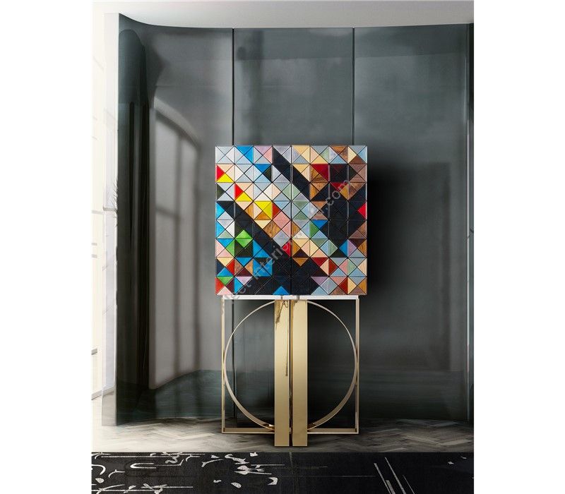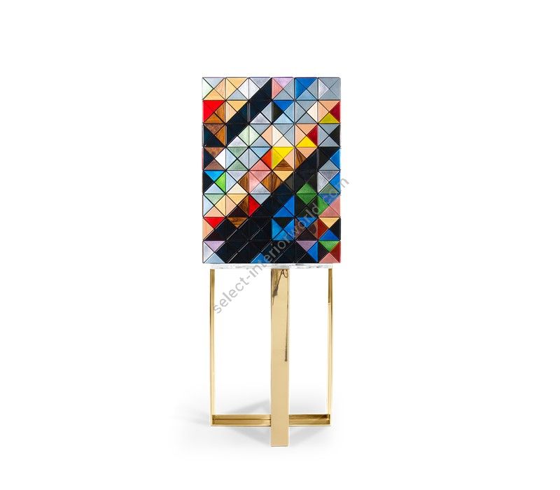Iconic and unparalleled, the Pixel Cabinet presents a ground-breaking work of pioneering design. This piece carries the dedication and art of those who built it, a variety of traditional production techniques to craft an avant-garde furniture piece that is authentic, joyful and a perfect match for the digital age. Its playful character is captured in shape and color palette, challenging design and finest craftsmanship. Made out of 1088 triangles, the upper part of the Pixel Cabinet plays with perception and combines exceptional materials with multicolored compositions to give the cabinet a unique, striking design: handmade leaf gilding triangles, 10 different types of wood leafs from palisander to African walnut veneer, and lacquering. Behind its two doors, this bar cabinet surprises with a timeless combination of aged mirror and a diamond quilted blue silk fabric, containing nine interior drawers, each one with its own golden knob. The polished brass base gives Pixel a unique and sophisticated character.