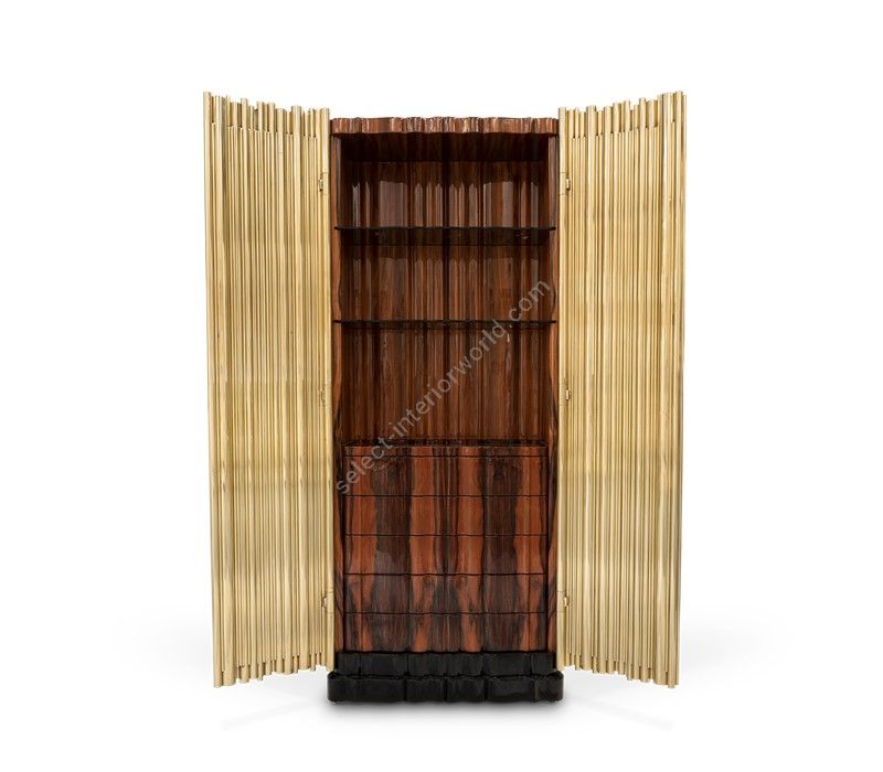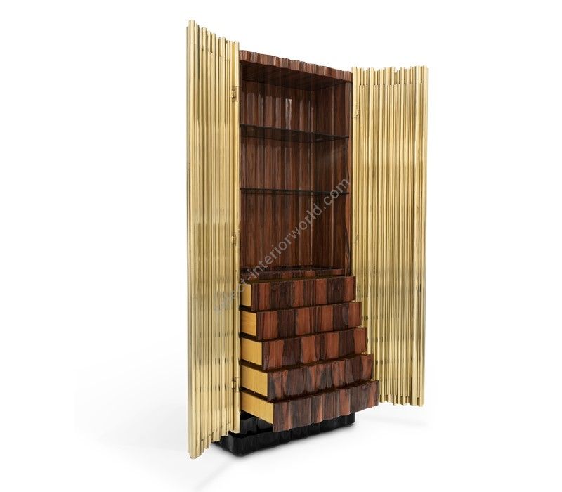 Covered by a tubular structure in gold pated brass, the Cabinet's interior is finished in Palisander, with two shelves and a set of drawers also finished in Palisander and gold-leaf.