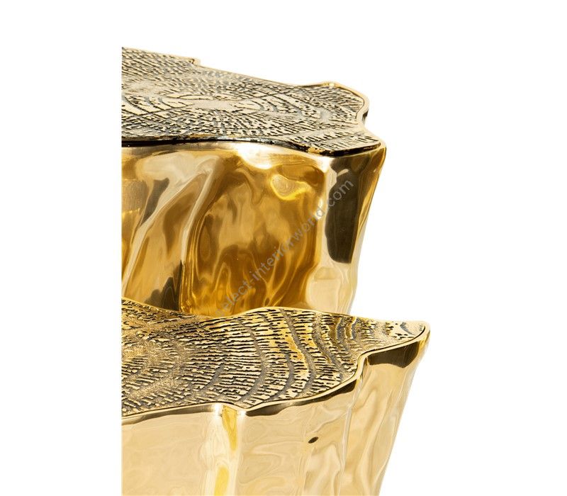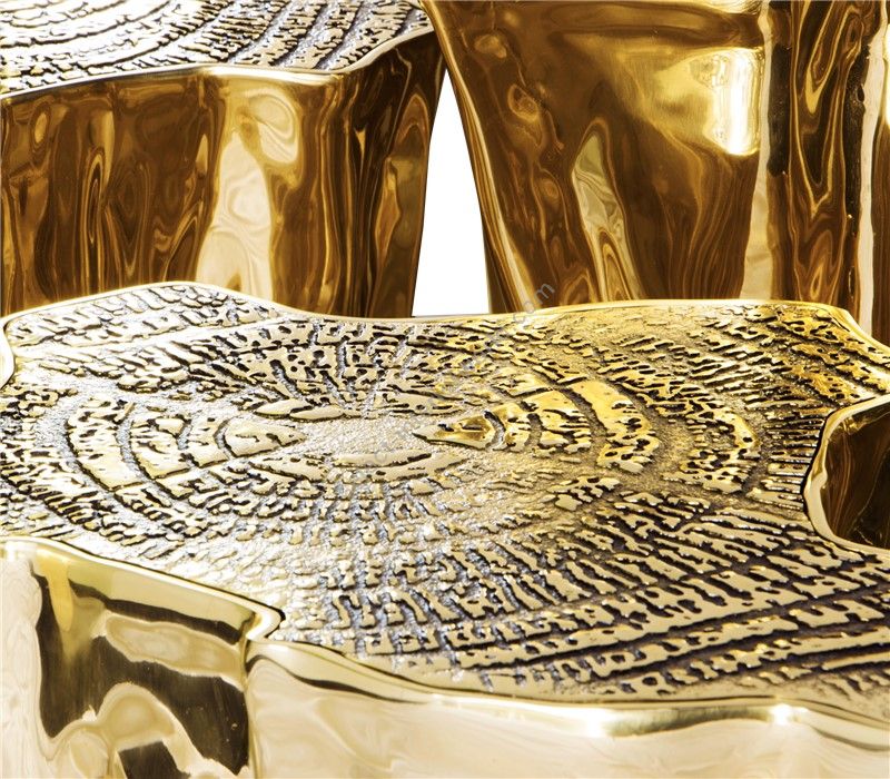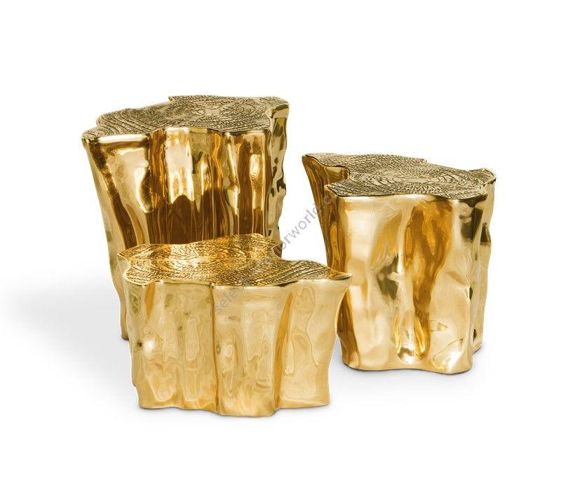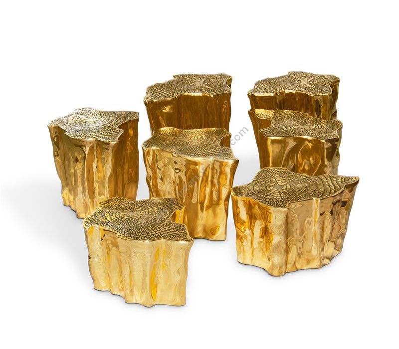 The mystic behind the name inspires Eden. A slice of the tree of life that fell from the Garden of Eden, this accent coffee table set awakens desire and curiosity with its intriguing cut. Born from master artisans and the ancient technique of polished cast brass, these statement design pieces incorporate nature-inspired design with industrious welding techniques, being manually assembled, making each piece unique. With delicate lines and bold details, a manually engraved top exposes the heart of a golden tree, boasting a sinuous gold plated base that stood the test of time. It is available in groups of 7, 8 or 14 pieces, with different heights, for unexpected combinations. The remarkable and already time-honoured piece, Eden coffee table series combine with both contemporary and modern design styles, classy rooms waiting for superior craftsmanship and iconic design.