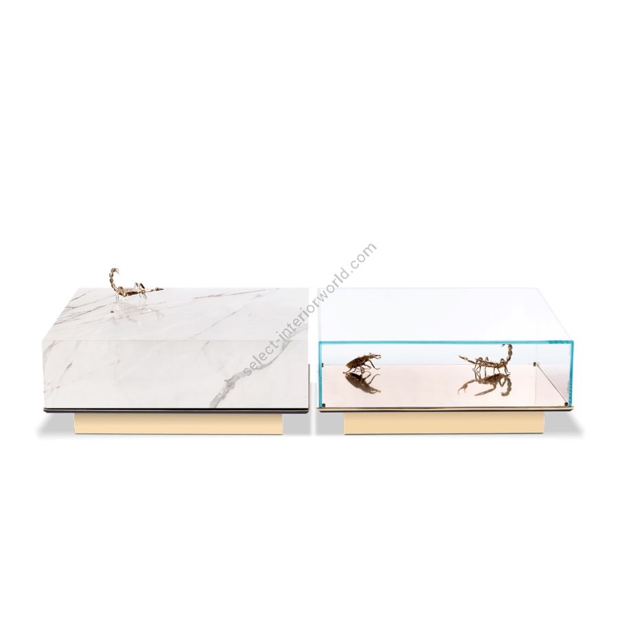 A set of two tables. One module is composed of a glass box which envelopes 3 gold plated elements of 2x scorpion and 1x pollock beatle, laying in a base of gold plated brass. The second module is composed of marble box over wood structure, gold plated base.