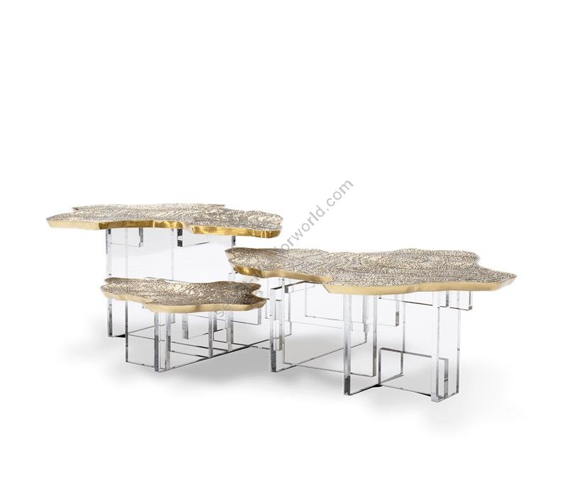 Depicting nature in an innovative way, the Water Lillies series are gently brought to life in an elegant coffee table with gold surface made from cast brass with a unique textured finish. Featuring both contrasting shapes and materials, as the unconventional compositions of the artist, the contemporary coffee table is supported by a geometric acrylic base, allowing to capture natural light. An immersive exceptional objet, the Monet center table is perfect for cutting-edge living rooms.