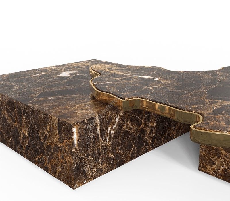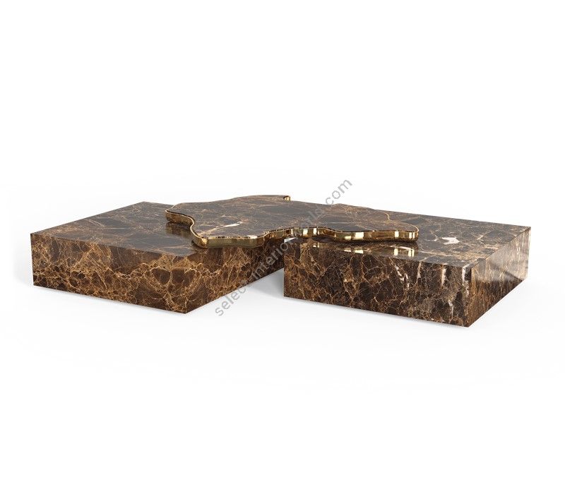 The design of Navarra modern center table captures unique Spanish warmth and finest craftsmanship. The rich colour background set off by thick and thin veins alike carries the eyes to the top of this table, framed by brass. Taking inspiration from its homeland, the Navarra coffee table brings an elegant flair into your home decoration. It is a contemporary center table composed by two square marble modules, linked by an organic marble surface element on top enveloped by casted brass. An exclusive design piece and polished choice for luxury home interiors.