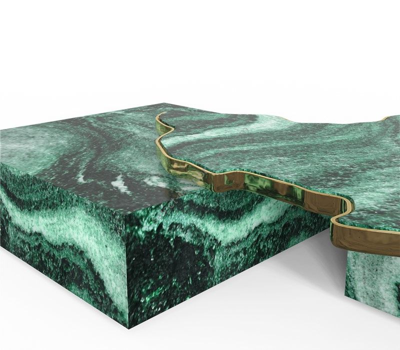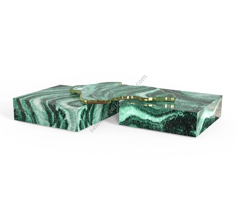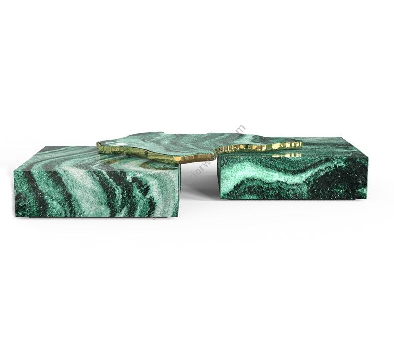 The design of Navarra modern center table captures unique Spanish warmth and finest craftsmanship. The rich colour background set off by thick and thin veins alike carries the eyes to the top of this table, framed by brass. Taking inspiration from its homeland, the Navarra coffee table brings an elegant flair into your home decoration. It is a contemporary center table composed by two square marble modules, linked by an organic marble surface element on top enveloped by casted brass. An exclusive design piece and polished choice for luxury home interiors.