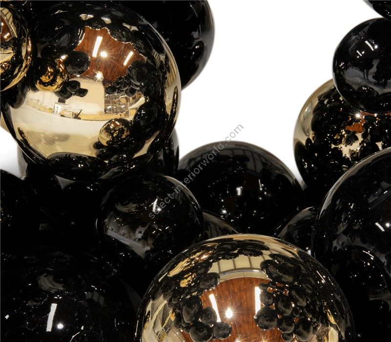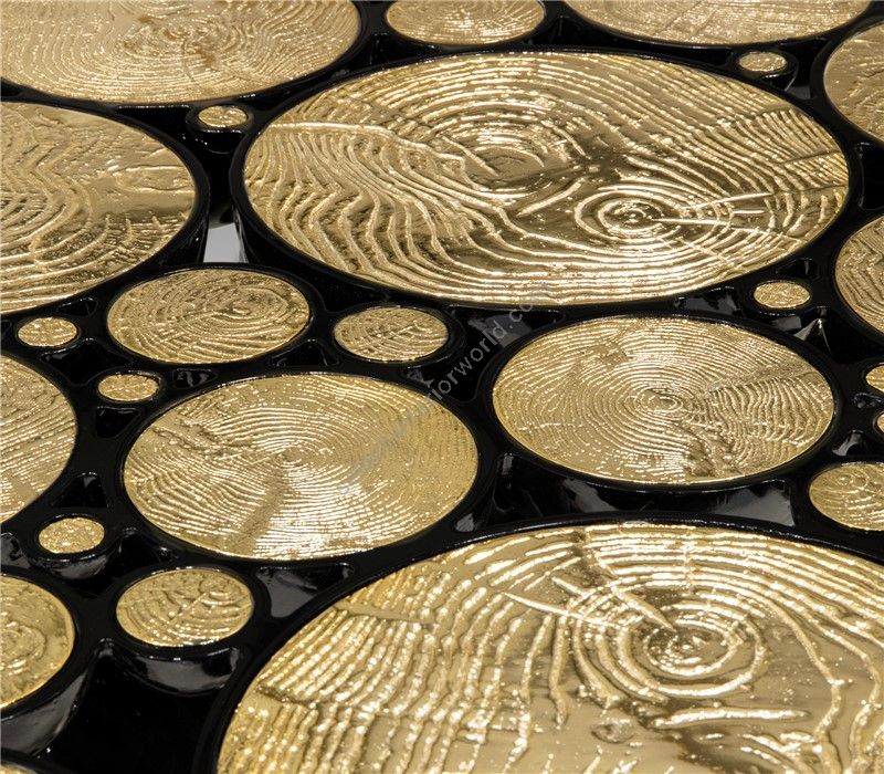 An oval center table built from aluminium spheres, joint to produce a pattern and structure, finished in black lacquer and gold plated. Its surface texture designed to resemble cut wood is gold plated.