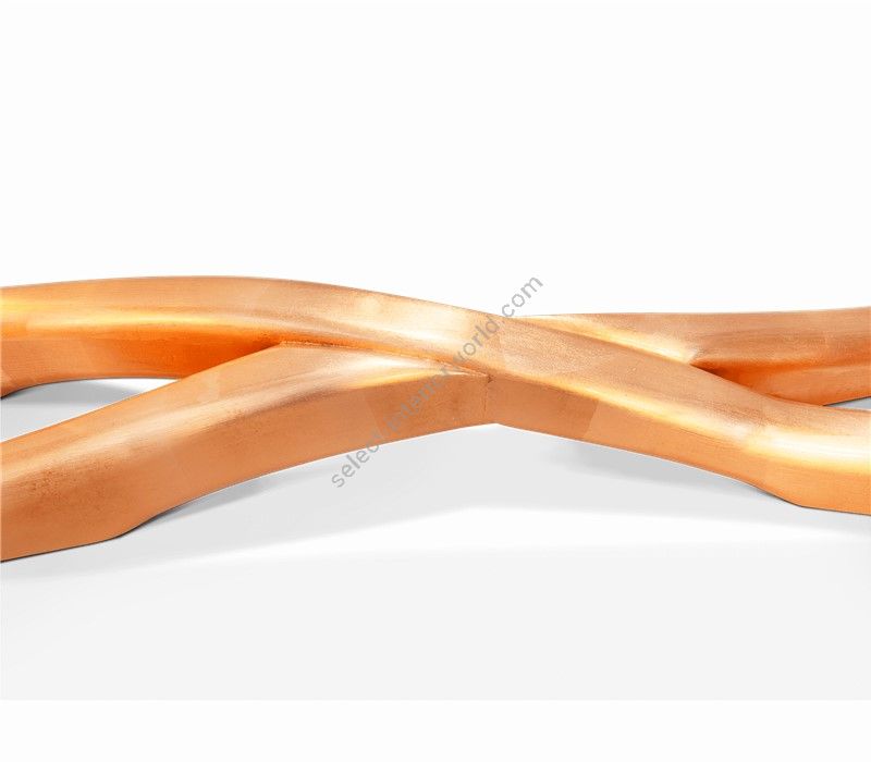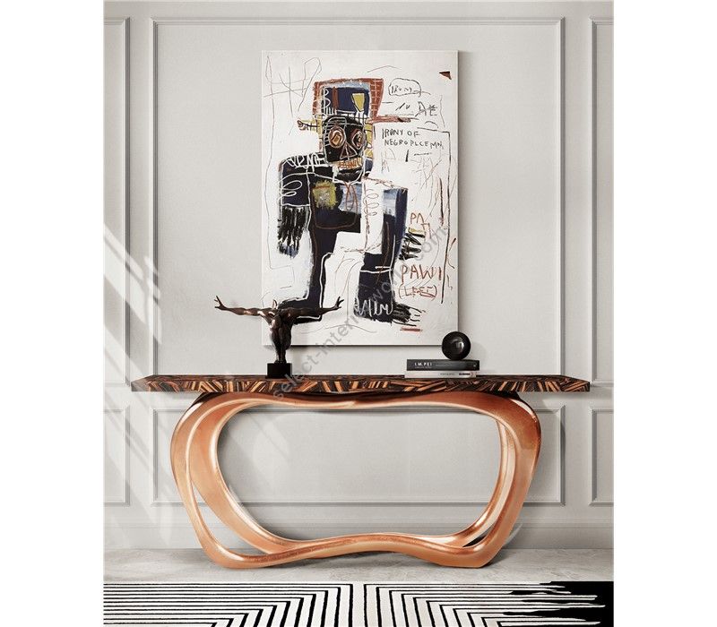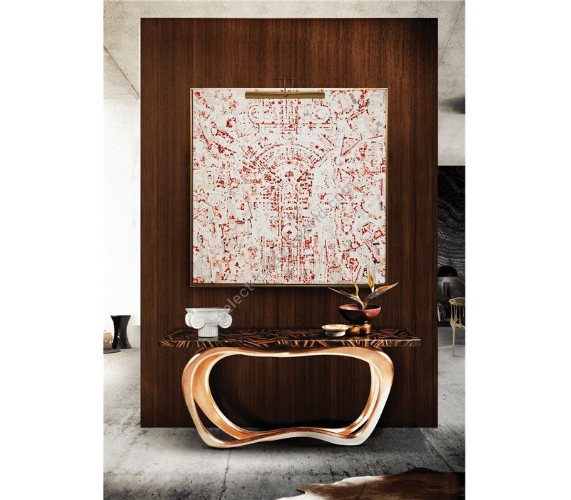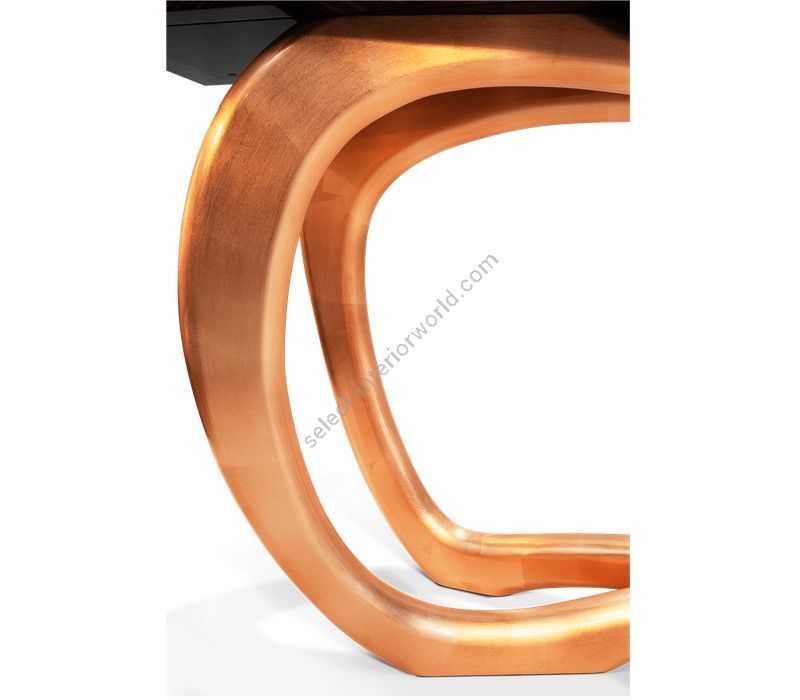 Boca do Lobo's furniture exhales style, grace and luxury and this is certainly the case for Infinity console, a fascinating and exclusive piece, proven to be impressive and eye-catching through its sinuous and elegant lines. Infinity holds a shimmering aura that gets a classy touch to any living area. Stunning in either modern or classic entrance halls and a great addition to any living room decoration, this prodigious piece has a striking geometric mosaic wood veneer top and a copper leaf base finished with high gloss varnish.