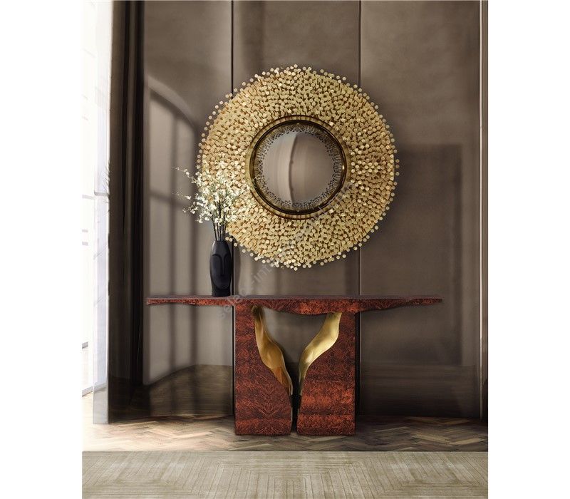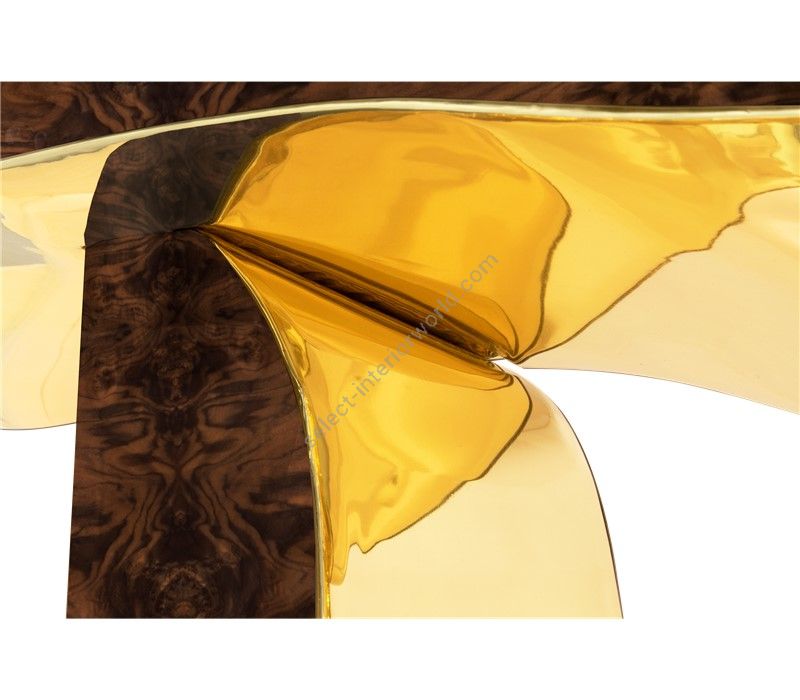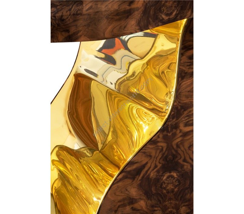 Lapiaz console takes exceptional craftsmanship and design to a new realm. With the inside finished in polished brass, and an exterior finished in a warmth walnut root wood veneer, its organic features are achieved through the manual fitting of the brass sheet, conveying both dynamics and elegance to bring a new contemporary verve into refined interiors. Finding beauty in the most unexpected places, this contemporary console is inspired by authentic karst formations created by surface dissolution, freezing or thawing of dolomite rocks. A functional artwork piece born from cold and freshly cracked to showing off the world rich, golden details.