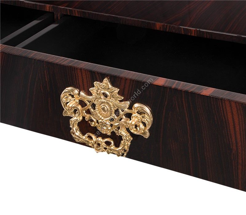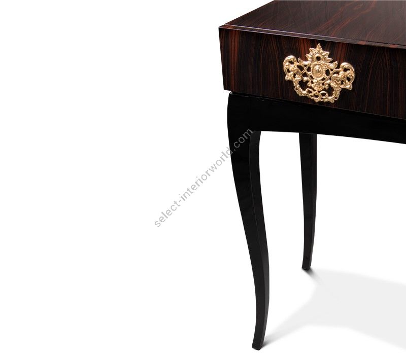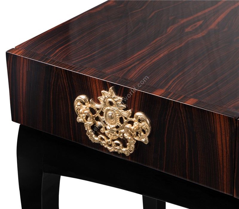 Mahogany Wood, Gold, Silver or Copper leaf, Polished Brass, Black Glass.