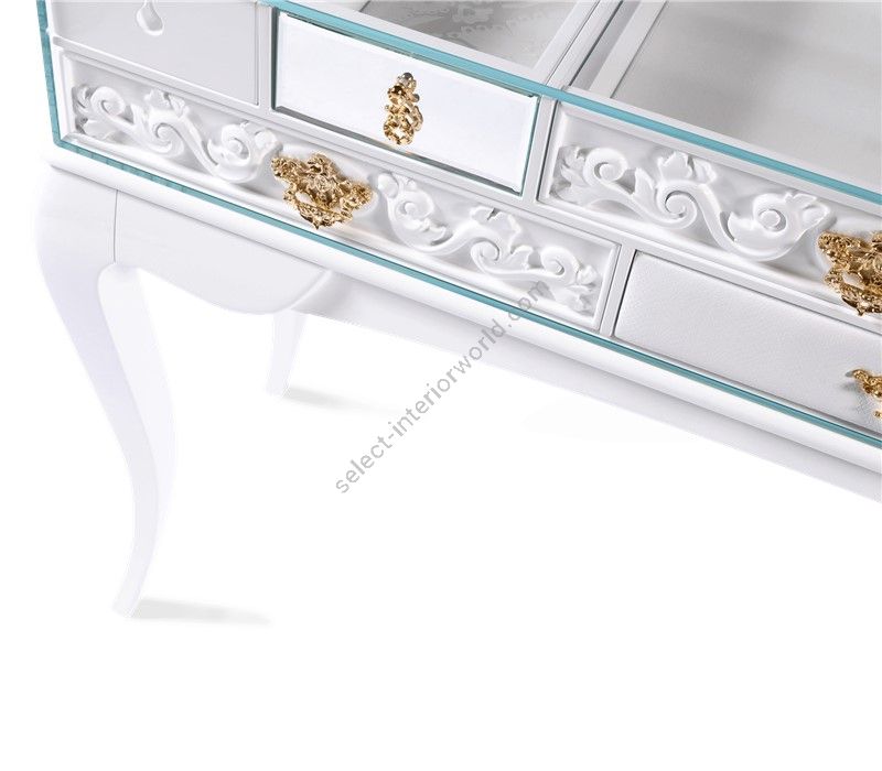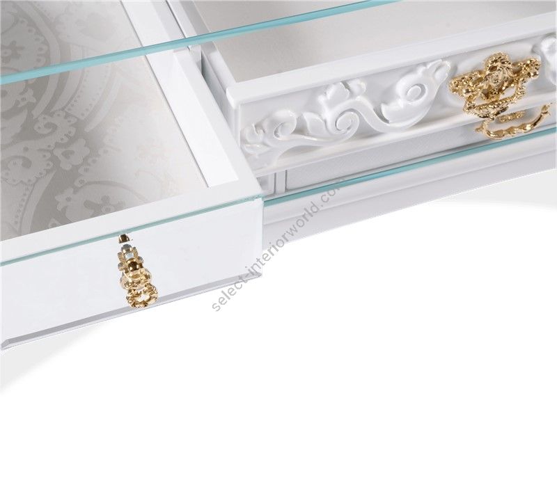 The base is composed by mahogany. The box is made by tempered glass with a frontal opening for the drawers. The structure is made in wood lacquered in white with a matt varnish; the drawers are handcrafted and contain wadding and a grey mirror. Handles are made through foundry process.