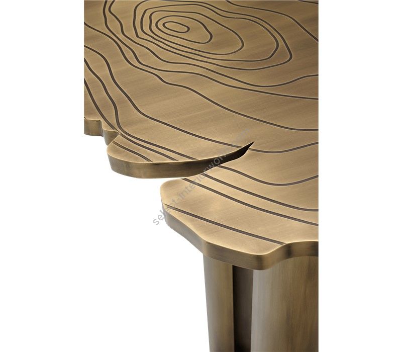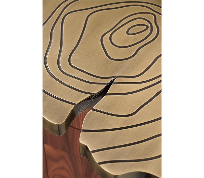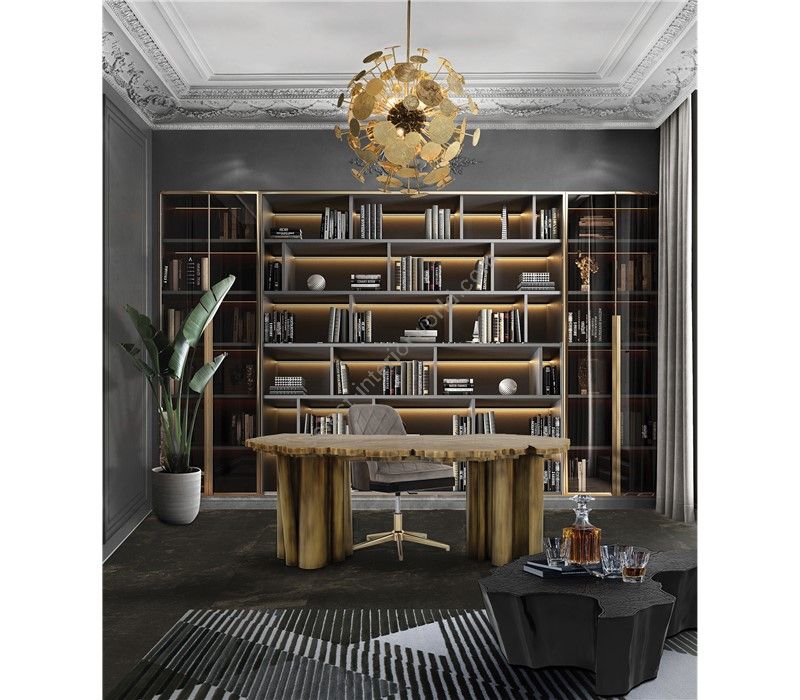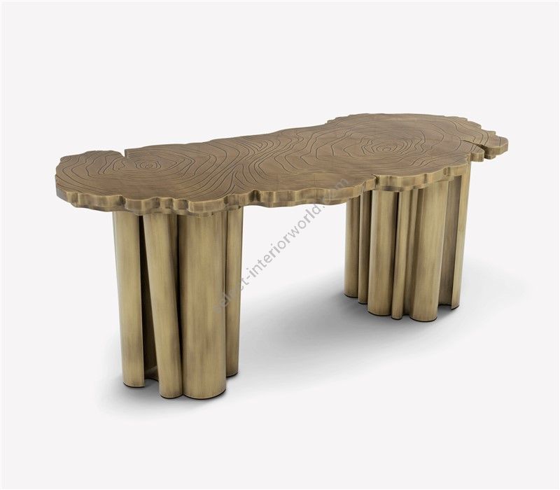 Fortuna is a contemporary office desk with a unique design aesthetic and refined statement to the most influential minds. This modern desk incorporates nature-inspired design, industrious welding techniques and a manually engraved top that emulates the outlines of log rings, reminding the timeline of a tree. Below the large desktop is an elegant composition of two scaled brass tubes, each one holding two drawers and one door covered by a sleek veneer, and a central drawer for files in between. Fortuna is a unique writing desk that embodies the fearless state mind of Boca do Lobo and the availability to customize the features to accommodate the most demanding client’s requirements.