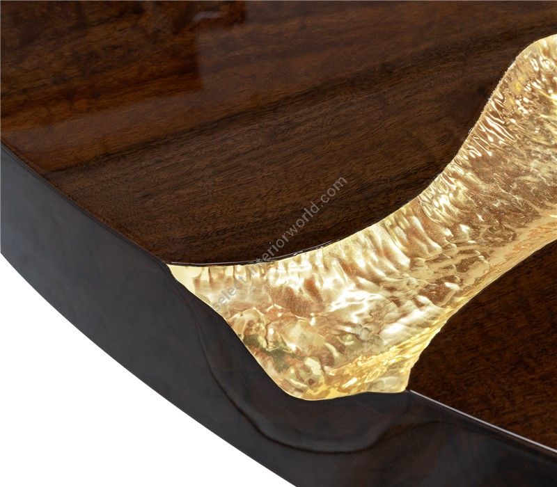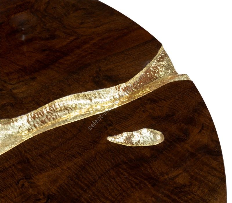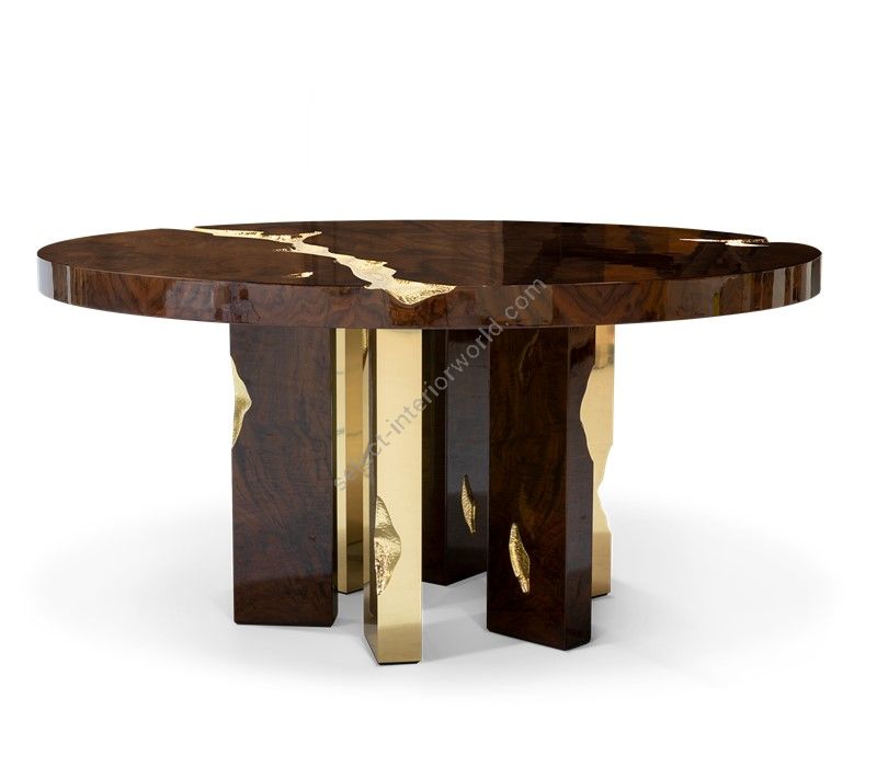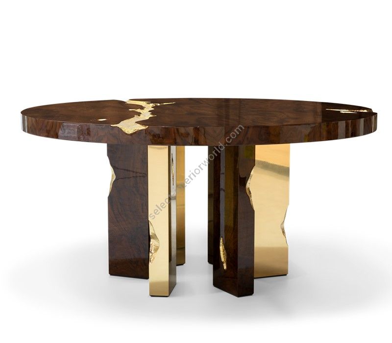 Made in wood and polished brass, this upscale round dining table is an elegant composition of two scaled organic brass tubes. It incorporates richest nature-inspired design, industrious welding techniques and a manually engraved top that emulates the outlines of log rings, reminding the timeline of a tree.