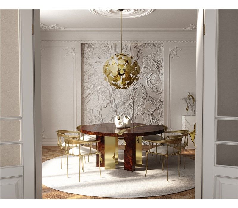 Great Empires take centuries to build, and those who rise after taking a fall find their true strength. It goes without saying that great decisions are taken around powerful tables among determined minds. The Empire dining table symbolizes generations of gatherings and decisions, both in times of celebration or tension. Its cracks reflect tough times, revealing a gold interior in a manifesto towards power. Flawless and bright, the remaining surface points towards a thriving future, reminding one to toast to prosperity.