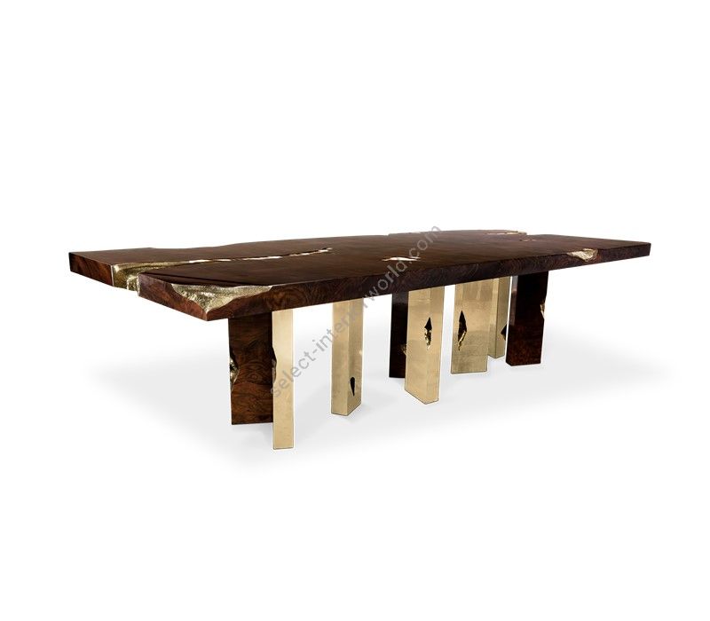 The Empire dining table’s surface is made in mahogany, coated in a fine wood veneer, with high polished brass details to fill the cracks. Its legs, also made from mahogany are finished the same way, and with polished brass sheets.
