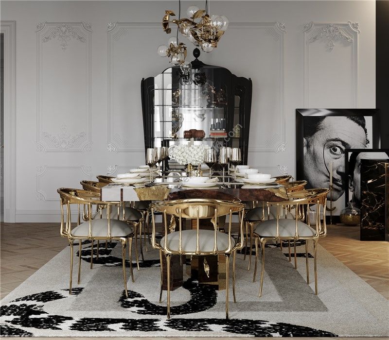 Great Empires take centuries to build, and those who rise after taking a fall find their true strength. It goes without saying that great decisions are taken around powerful tables among determined minds. The Empire dining table symbolizes generations of gatherings and decisions, both in times of celebration or tension. Its cracks reflect tough times, revealing a gold interior in a manifesto towards power. Flawless and bright, the remaining surface points towards a thriving future, reminding one to toast to prosperity.