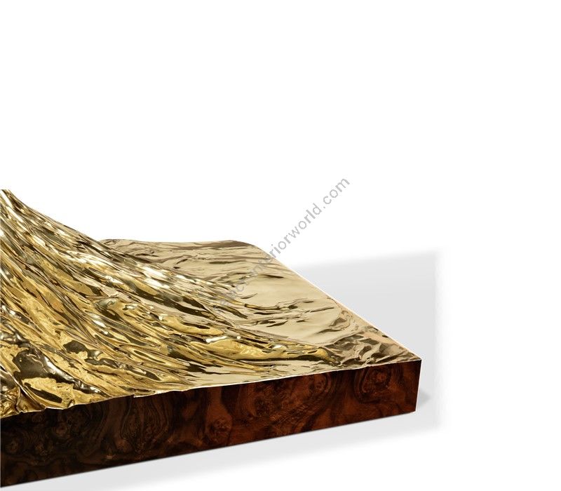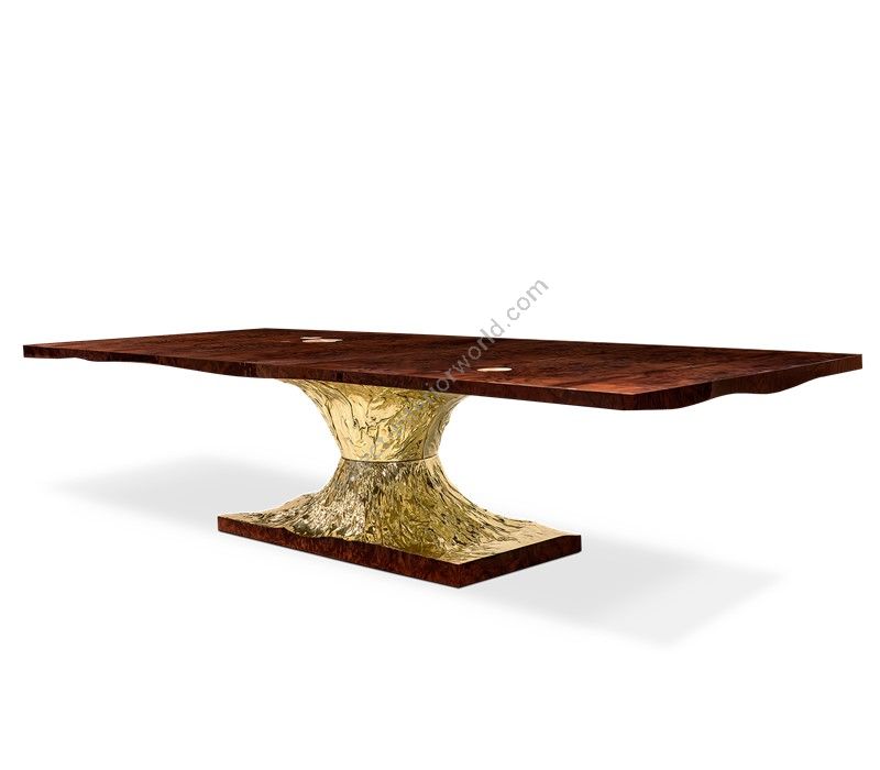 Metamorphosis Dining Table's surface is made in walnut root veneer and includes special textured details that represent a fossil. This piece also embodies high polished brass details to fill the stately base.