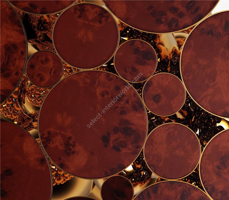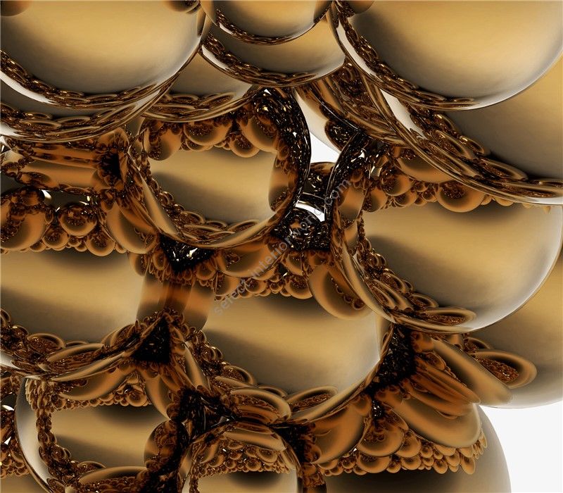 Built from gold plated brass spheres, joint to produce an outstanding pattern and structure. Its surface texture designed to resemble cut wood, is made of myrtle burl veneer.