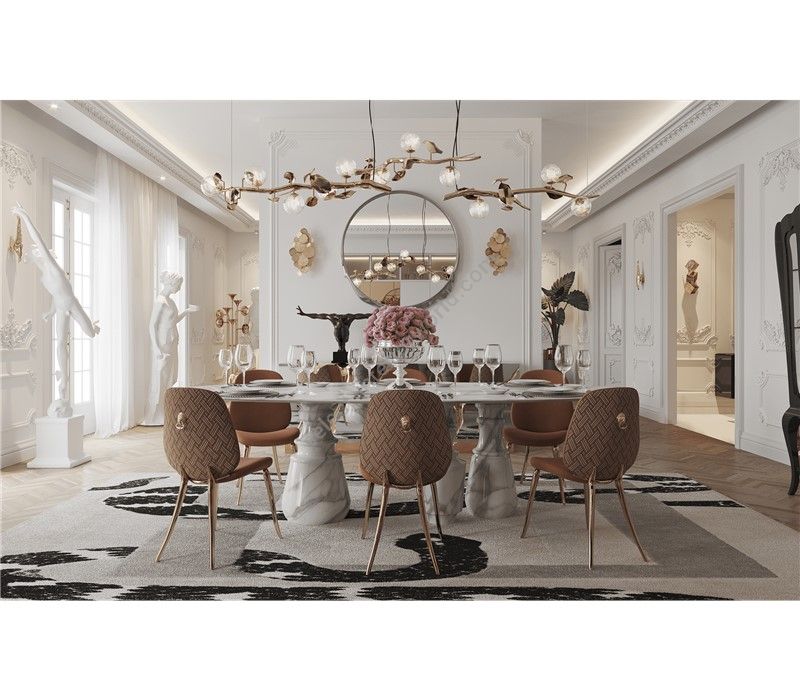 Playing with function and sculptural form, Pietra dining table shapes a timeless experience through its classical aura and finest Estremoz white marble. Reminding the renaissance era, its oval top gently lies in two robust marble columns, each one conceived from solid blocks hand-sculpted and turned to create different details for additional texture. A noble material carved in Boca do Lobo workshops, conceiving a soulful statement dining table ideal for elegant and refined dining rooms. Designed for eight seats, the contemporary feel of Pietra is effortlessly stylish and it is suitable for indoor or outdoor use.