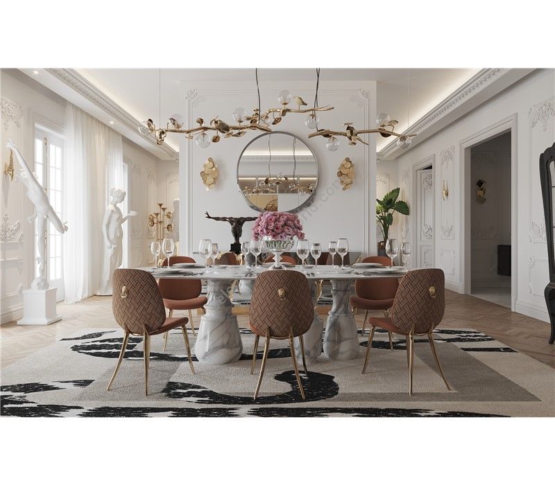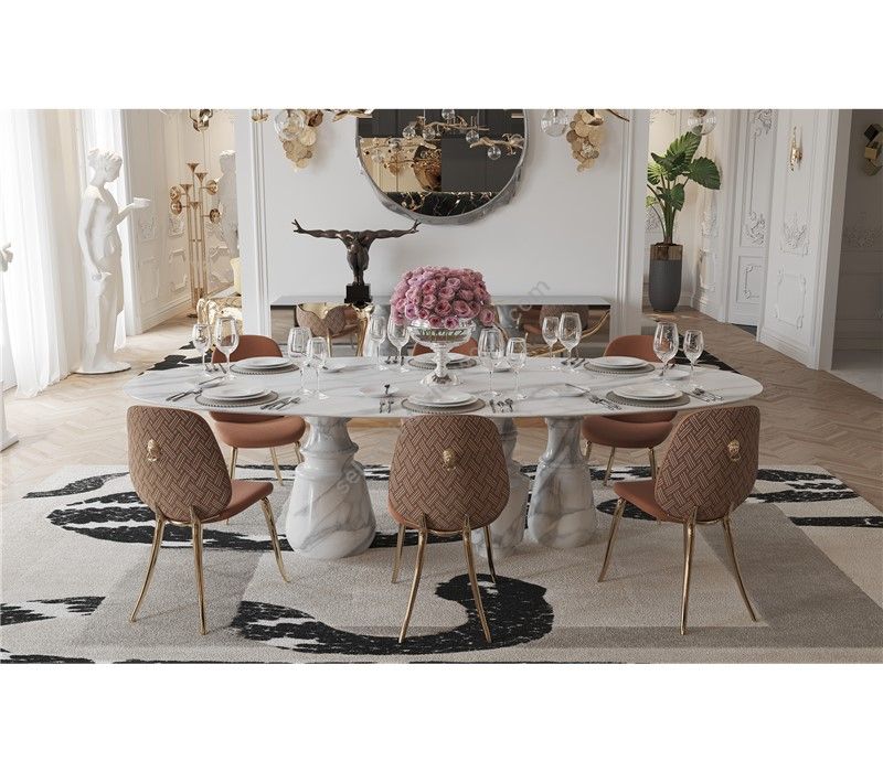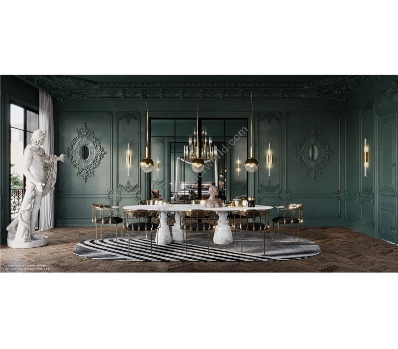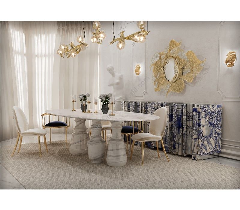 Reminding the renaissance era, its oval top gently lies in three robust marble columns, each one conceived from solid blocks hand-sculpted and turned to create different details for additional texture. A noble material carved in Boca do Lobo workshops, conceiving a soulful statement dining table ideal for elegant and refined dining rooms.