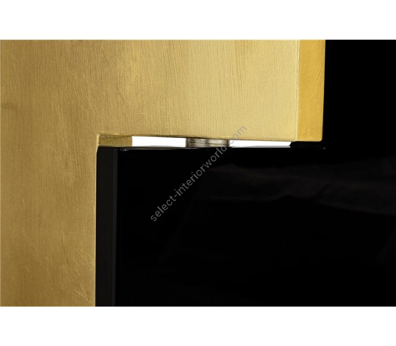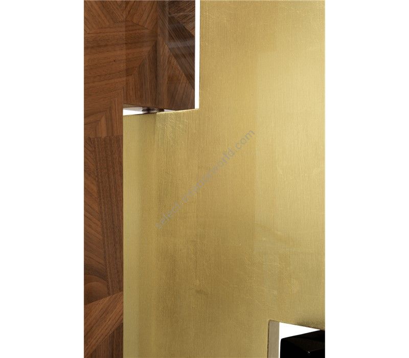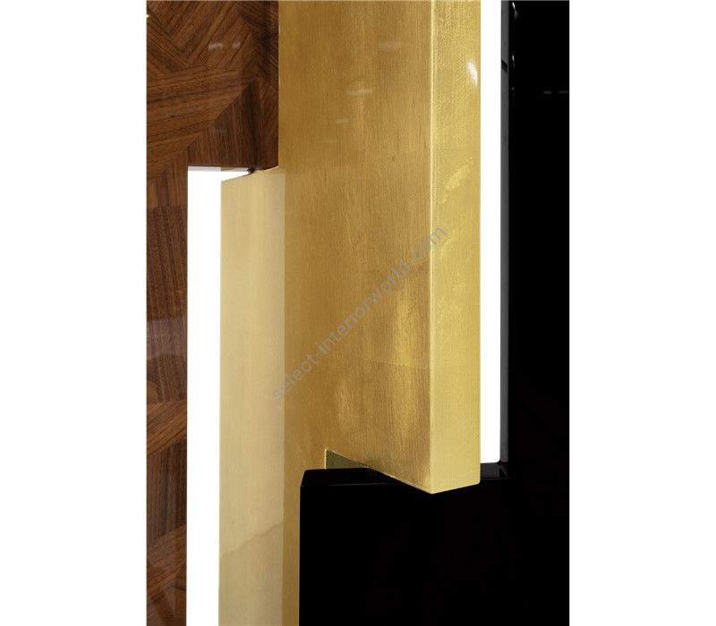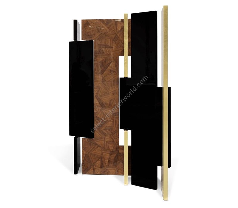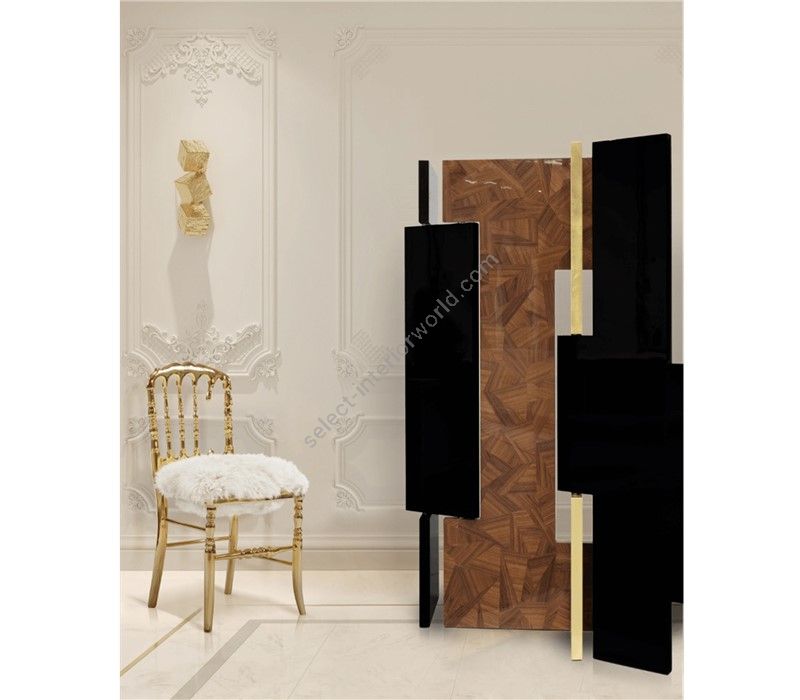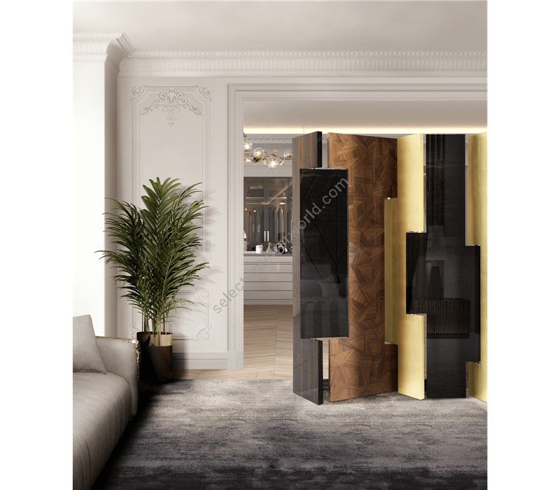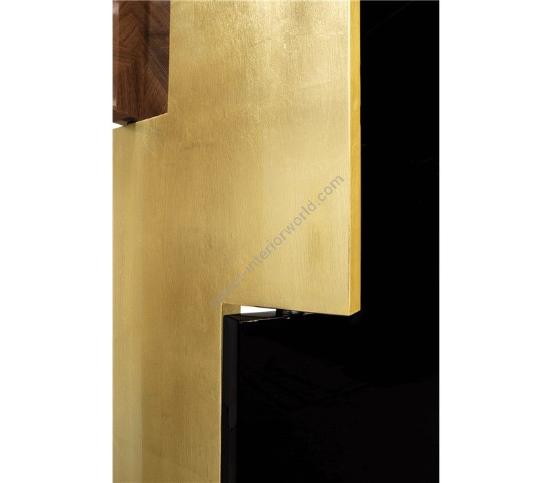 This distinctive folding screen is so elegant that can be easily placed in your home. Avenue is a striking piece that attracts attention and lightens the mood in any space. Its unique characteristics allow it to become a work of art by itself, or it can serve a functional purpose as a room divider. Place Avenue in your bedroom, in your entrance hall or in your living room. It will look beautifully in all of these spaces. Composed of six rotating panels finished in gold leaf with a high gloss varnish, black high gloss lacquer, and a geometric mosaic of walnut veneer and a book matched ebony veneer covered with high gloss varnish.